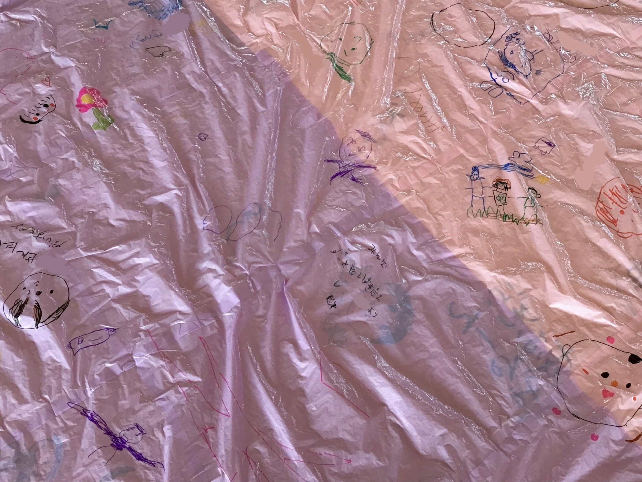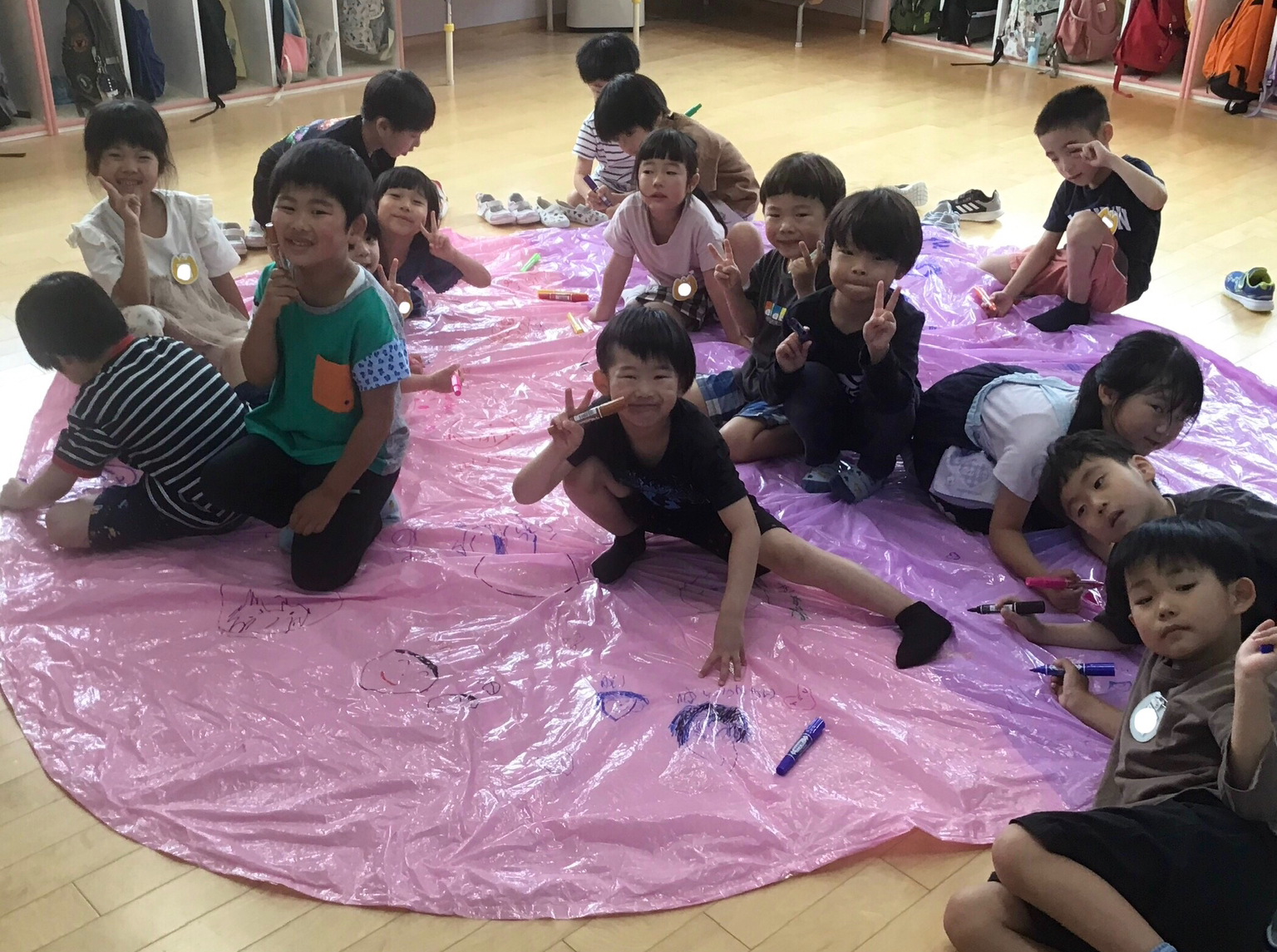 大きなバルーンを触る前に、6月頃から手作りのバルーンで遊んでいました。「あおぞらバルーン」と名付けてみんなで絵を描きましたよ!