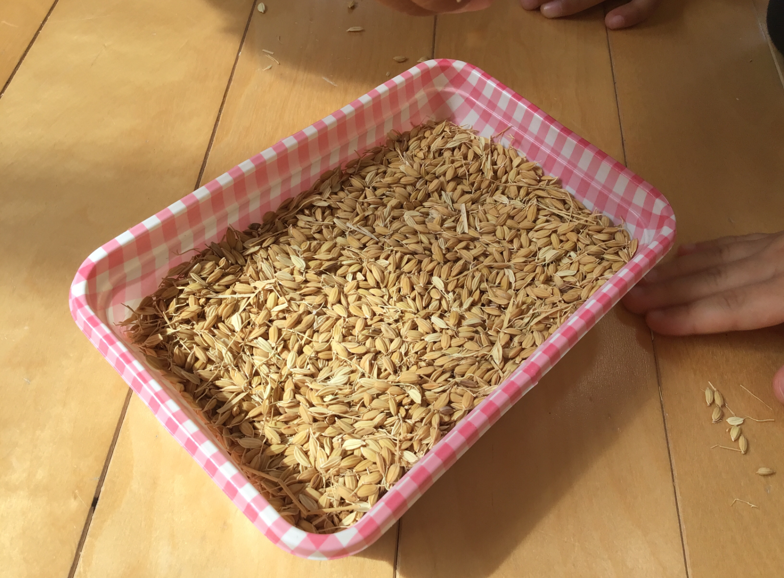 「先生~これたくさん時間あっても足りないよ~」「お米にするまでにとっても時間がかかるんだね…」とこどもたち。「お米の神様大事にしよう!」とテーブルから落ちたお米も大事に拾っていました。