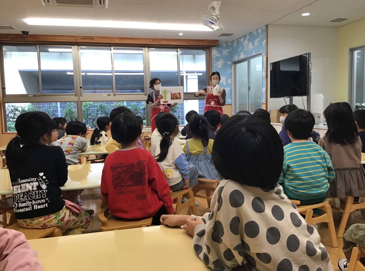 「シャカシャカおにぎり」の会が始まると、農協の方々からお米や秋の食べ物について教えてもらい、秋の食べ物クイズも楽しそうに参加していたあおぞら組さんでした。
