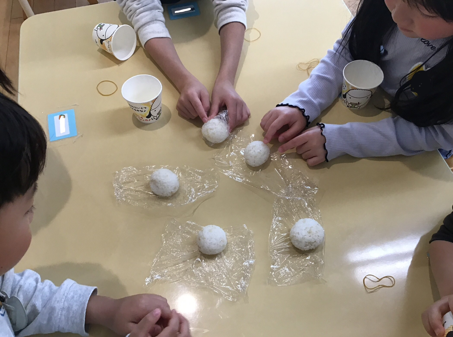 紙コップに入ったお米をシャカシャカしながら丸くしていきます🍙