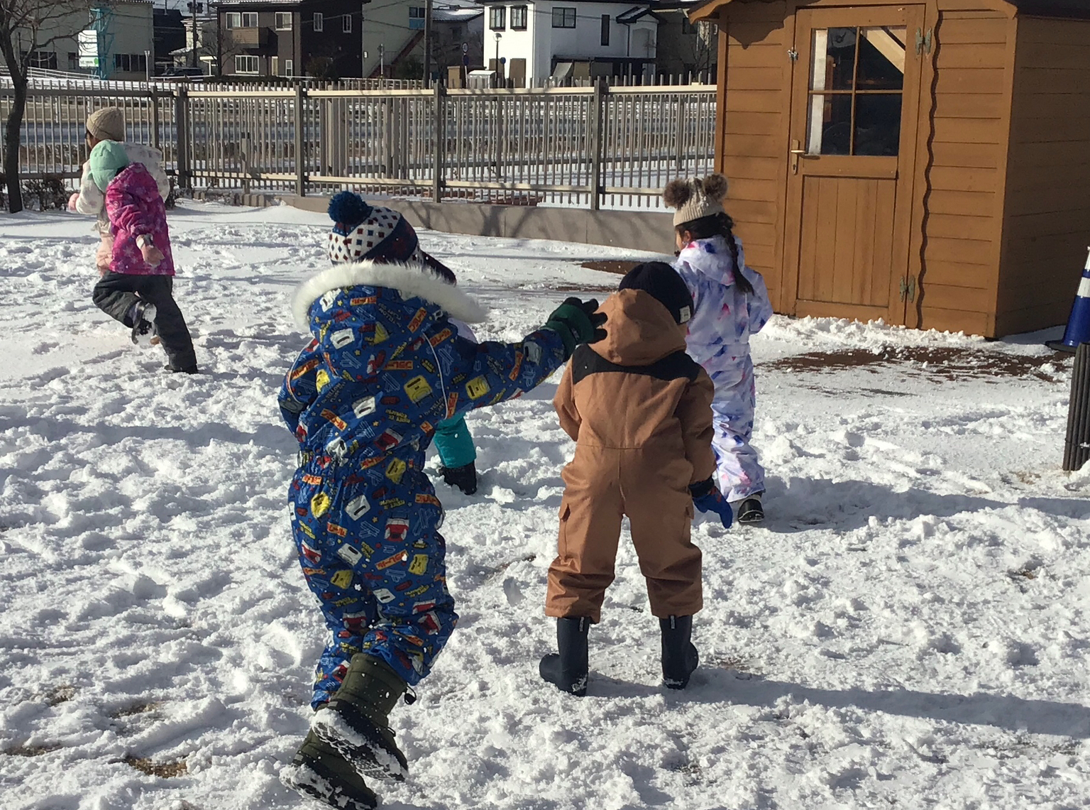 園庭に出ると「雪だるま作ろう」「雪合戦しよう」「寝っ転がっていい?」と大興奮。