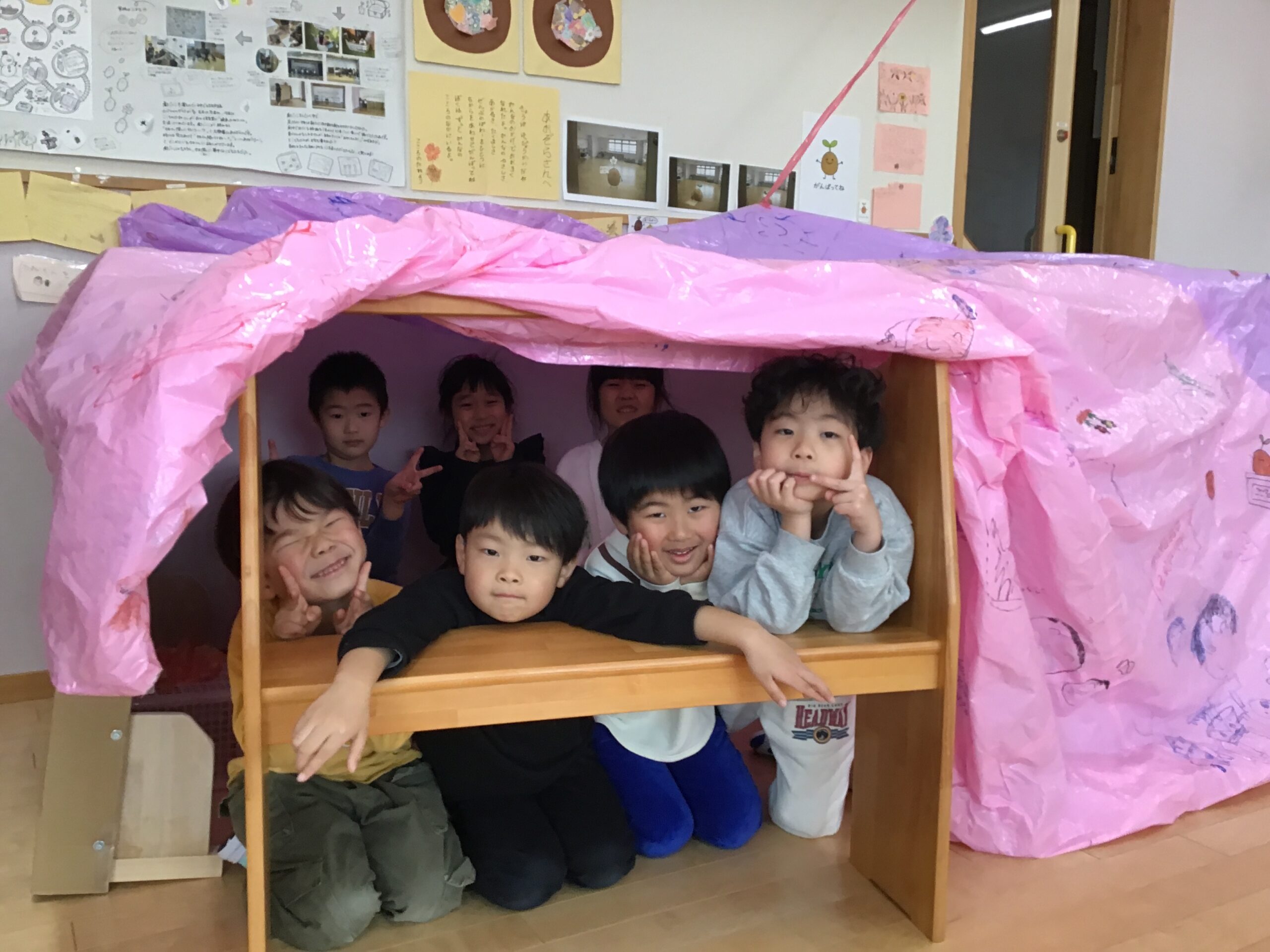秘密基地の中からはみんなの絵が透けて見えていて