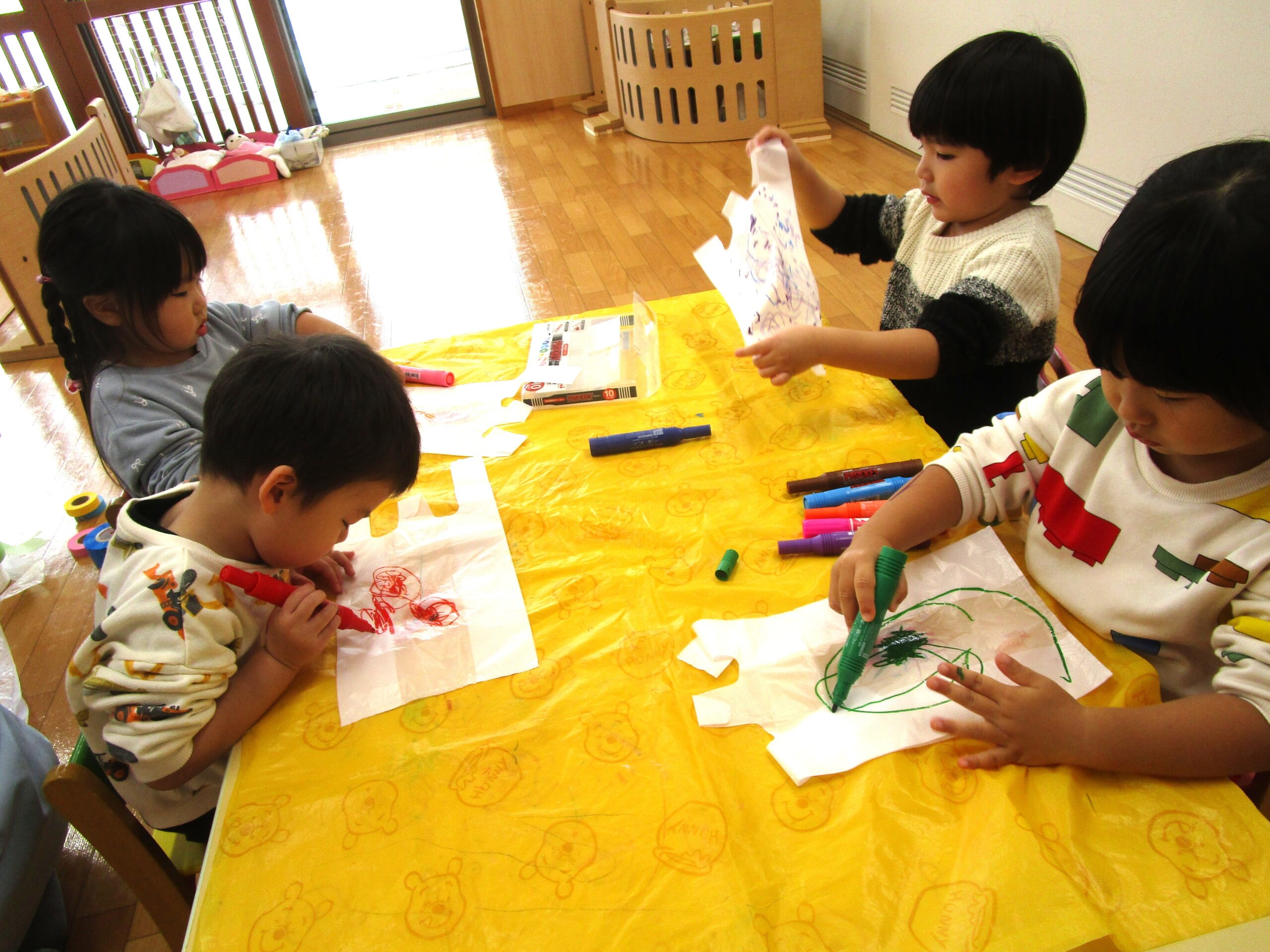 こどもたちがビニール袋にペンで自由に描き、飾りをつけて完成させました。