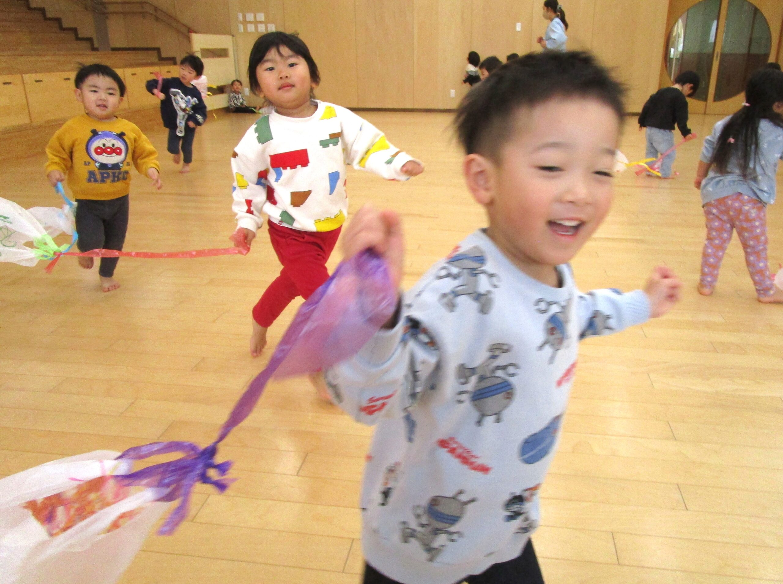 今日はお正月あそびのひとつ、凧を作ってみんなであそびました。
