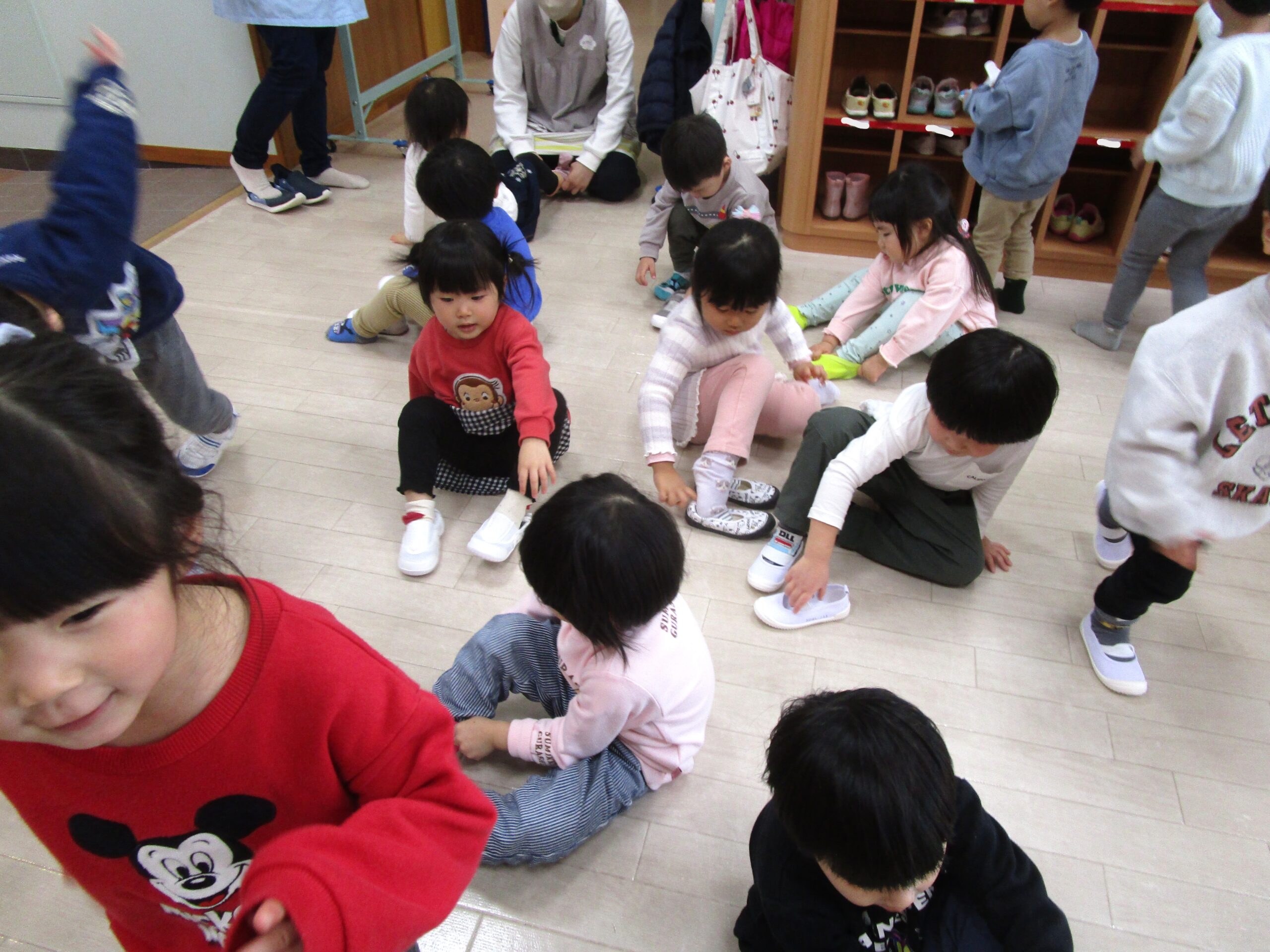 「これあってる?」と左右を保育者に確認しながら一生懸命履いていますよ。