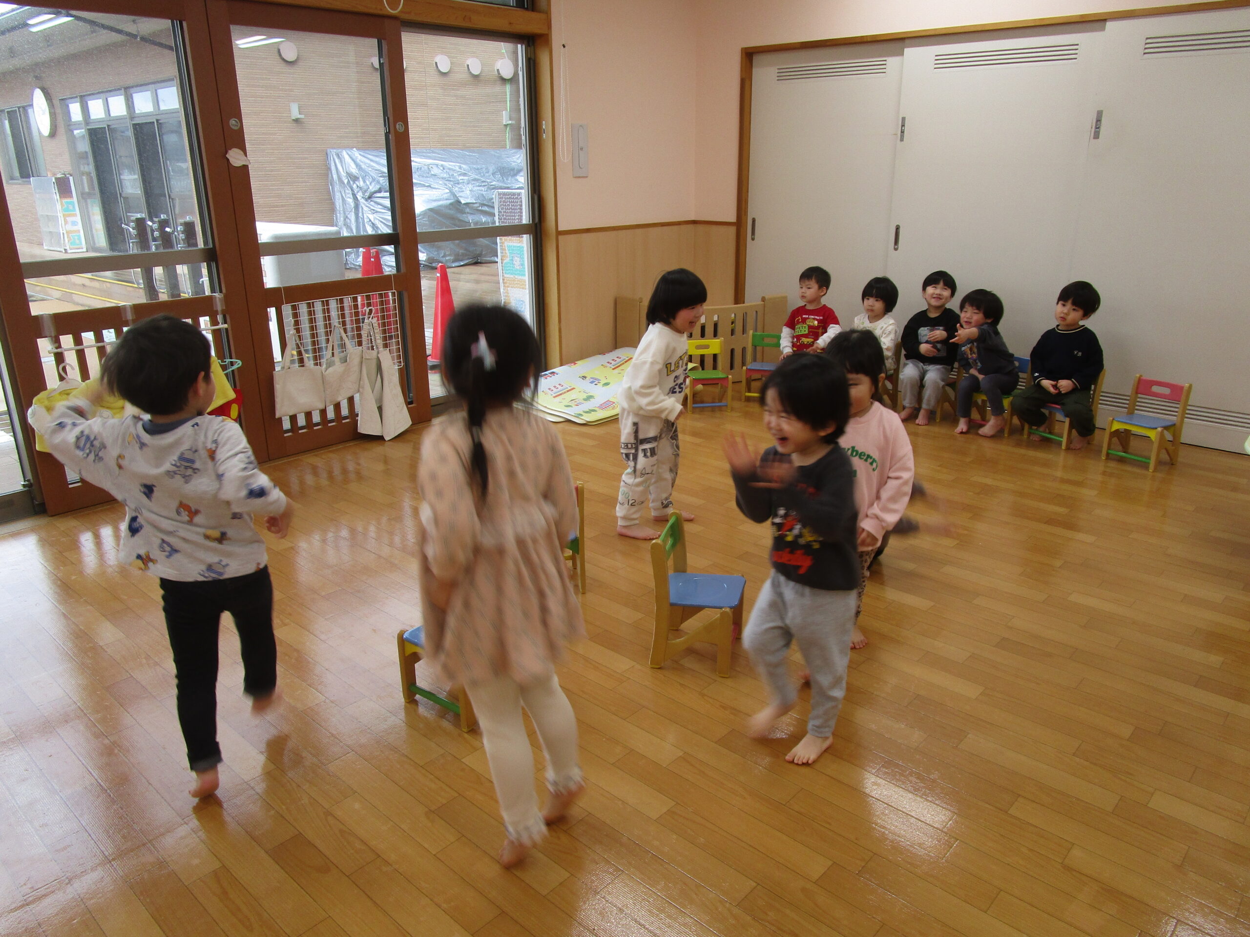 椅子取りゲーム中、発表会で踊った音楽が流れると