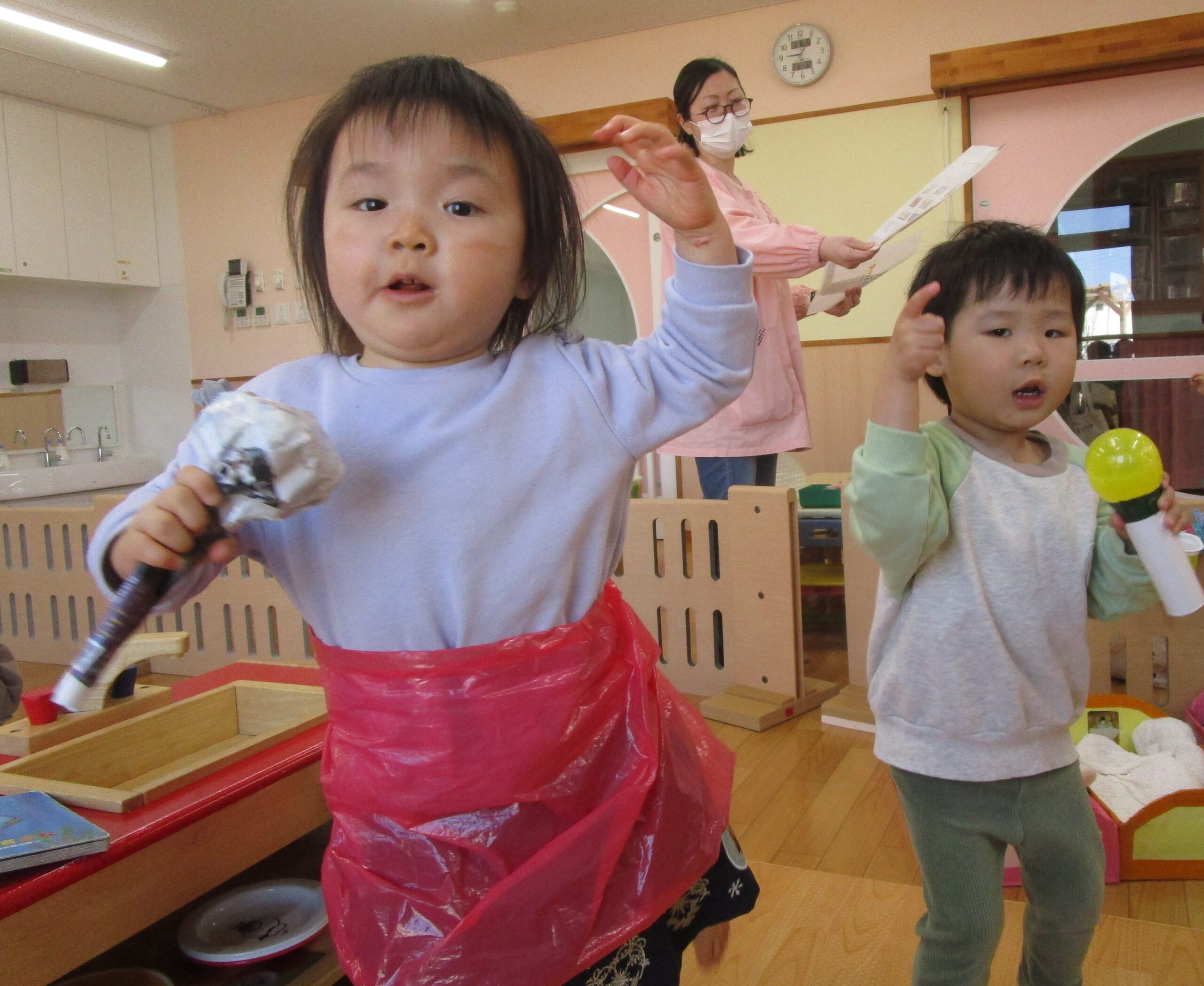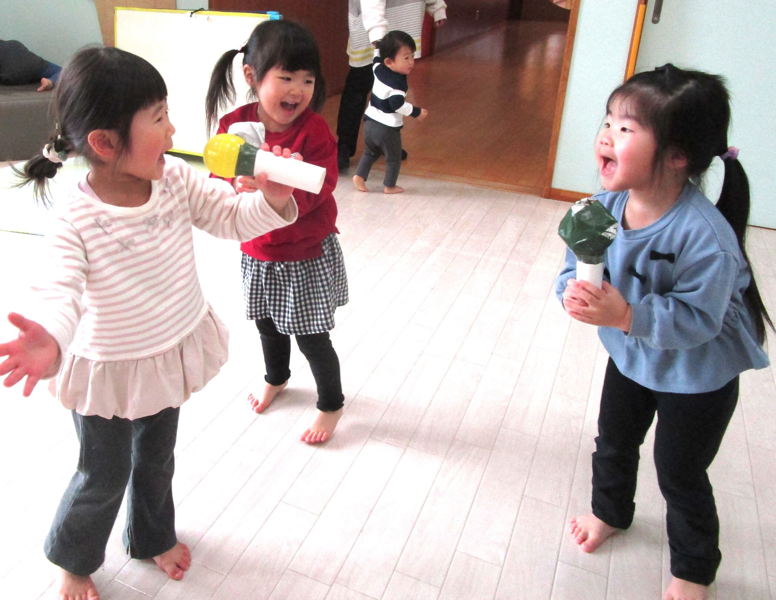 手作りのマイクを持って、歌や踊りを友だちと一緒に楽しんでいましたよ。