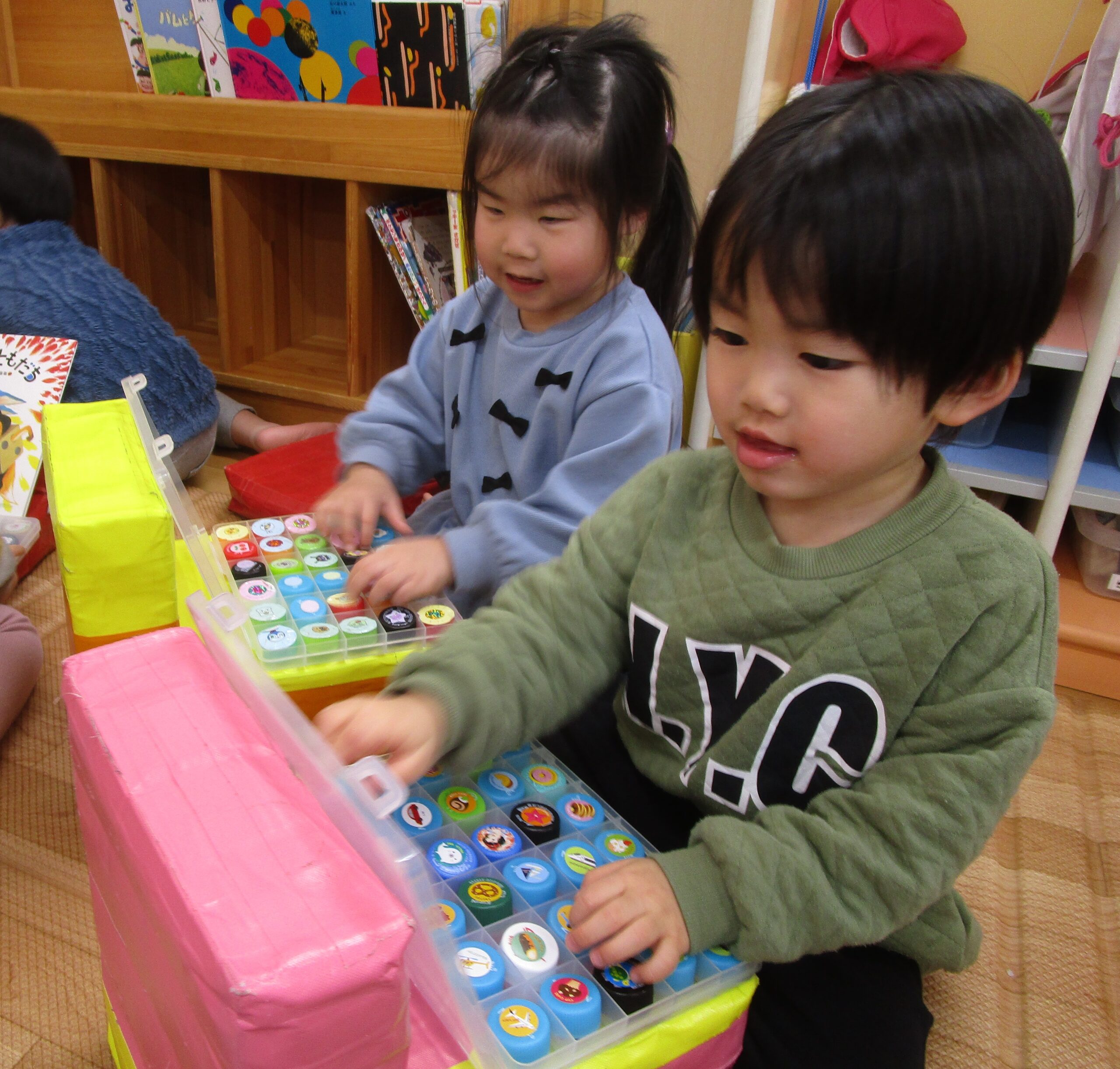 もう一つのブームはペットボトルキャップのパズルをパソコンに見立てたお仕事ごっこです。