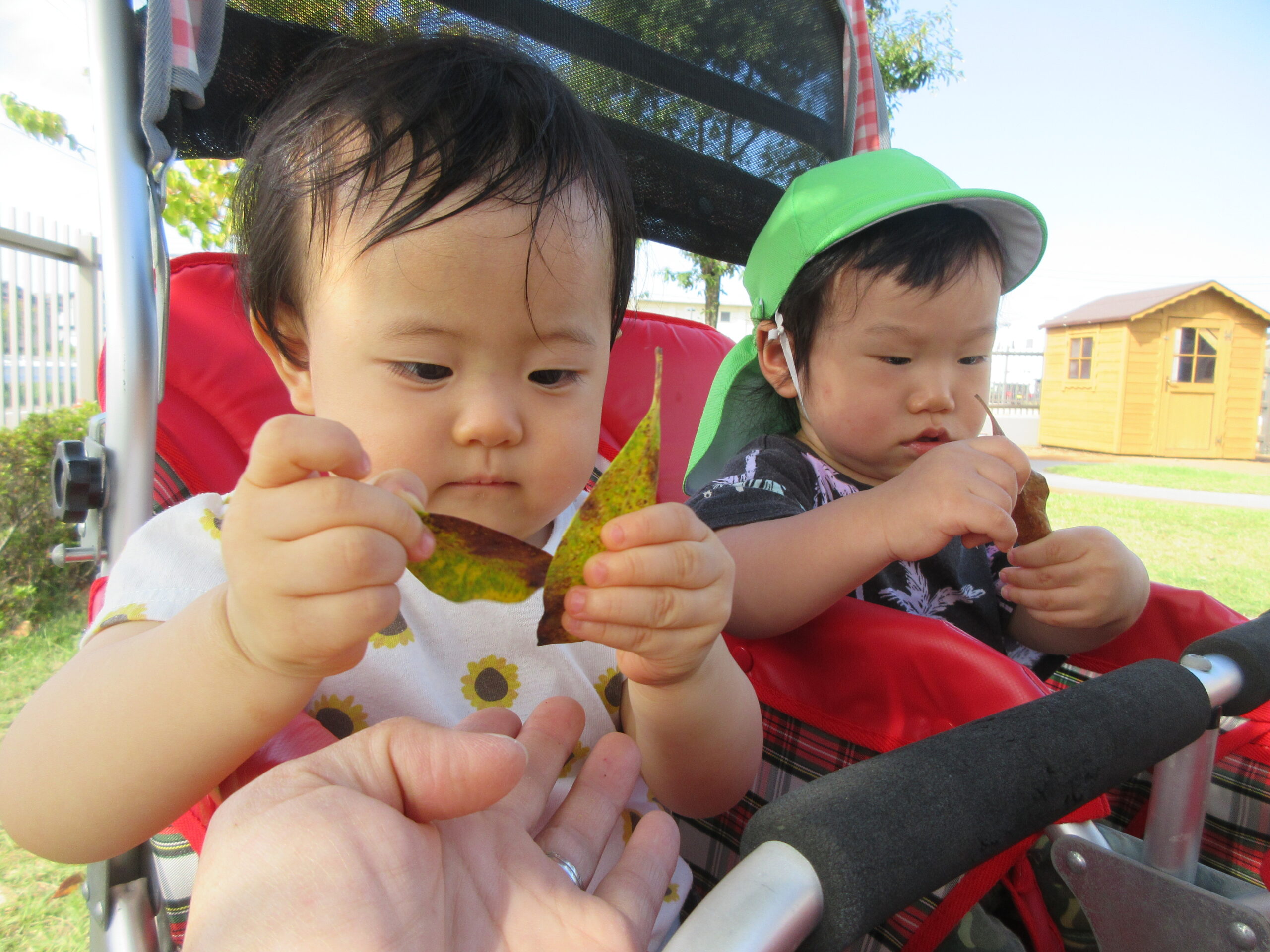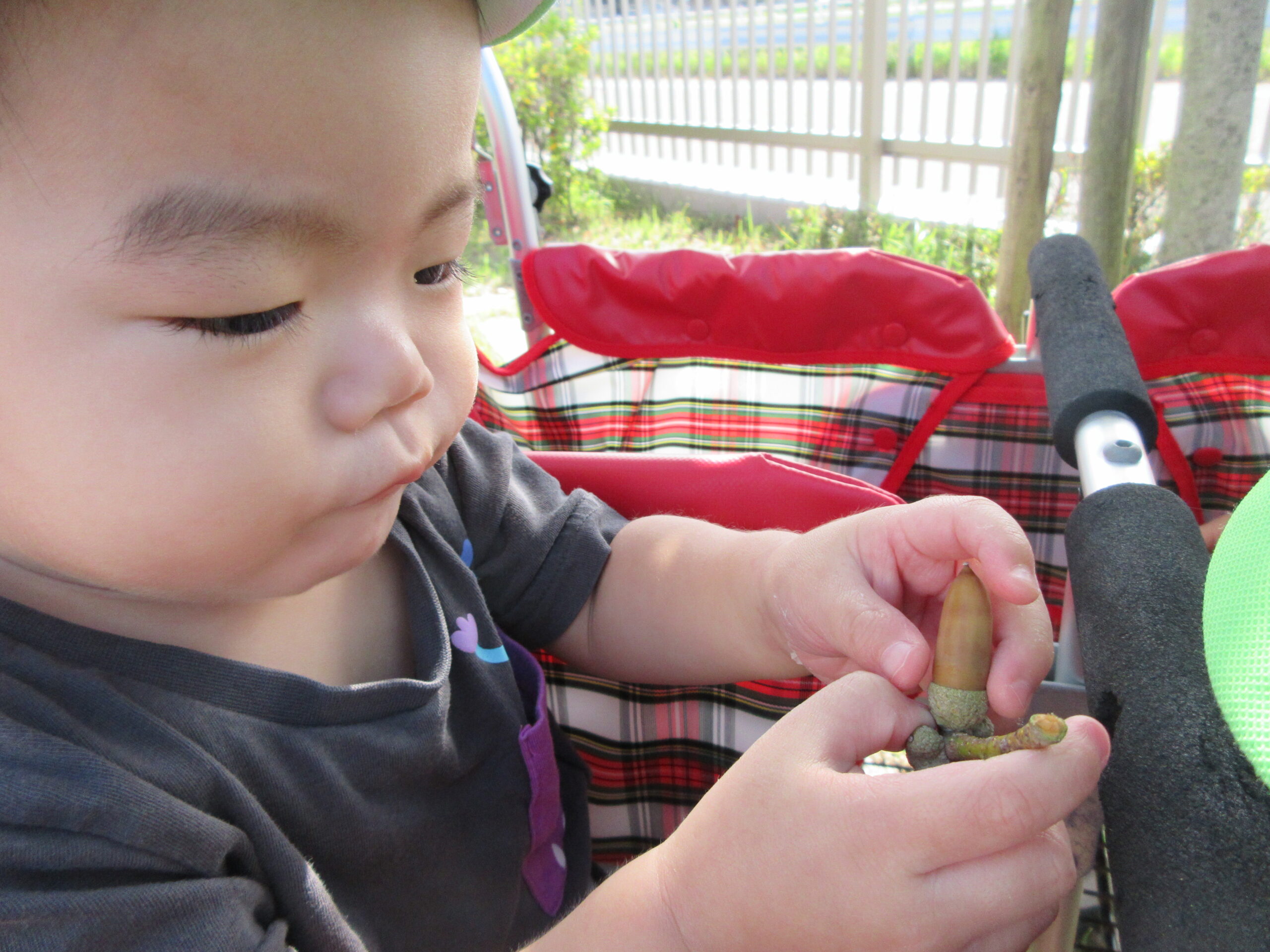 どんぐりや落ち葉をにぎり、じっと見つめたり、カサカサをゆらしてみたり・・・