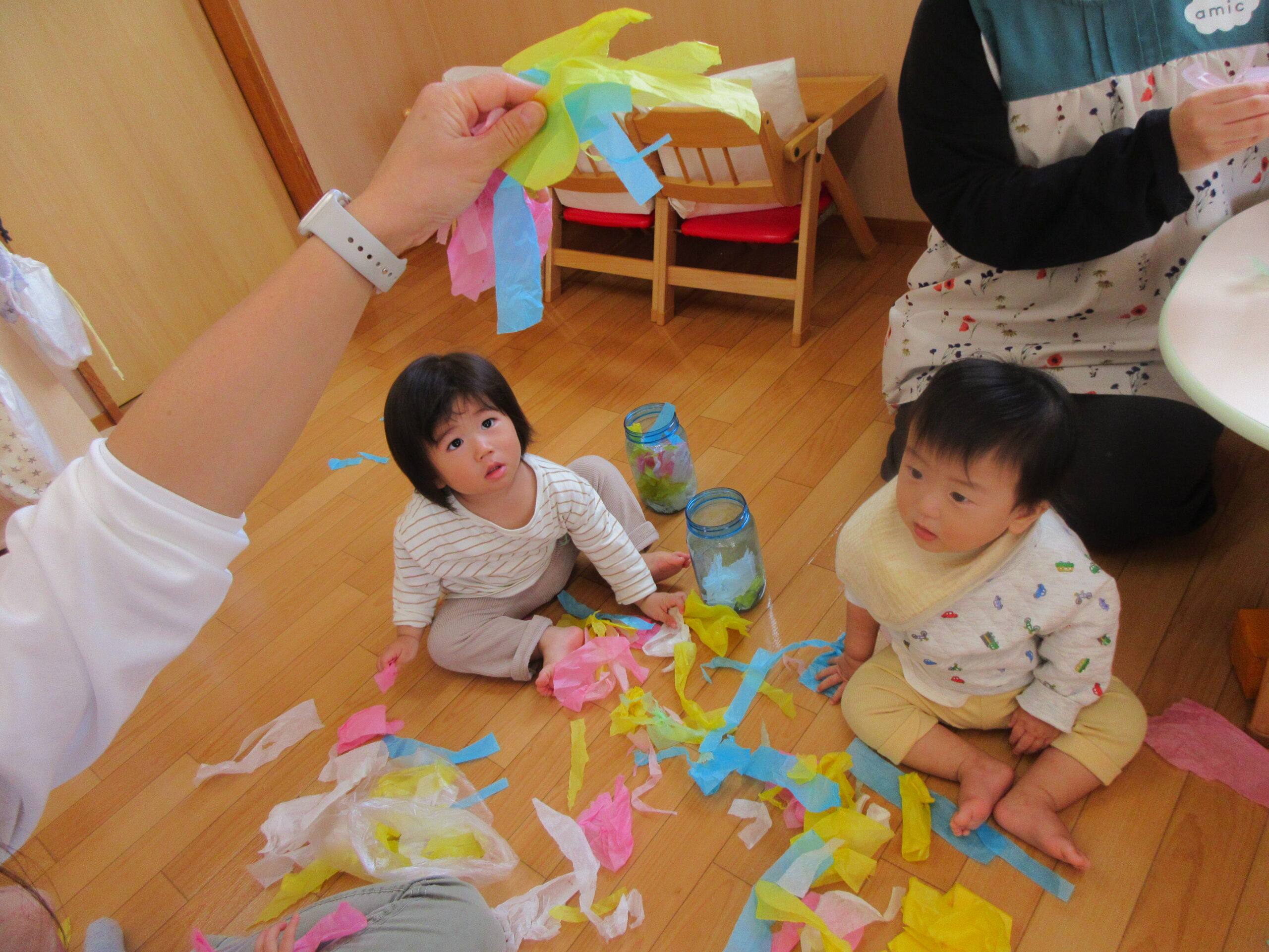 初めて見るおはながみに興味津々のこどもたち。