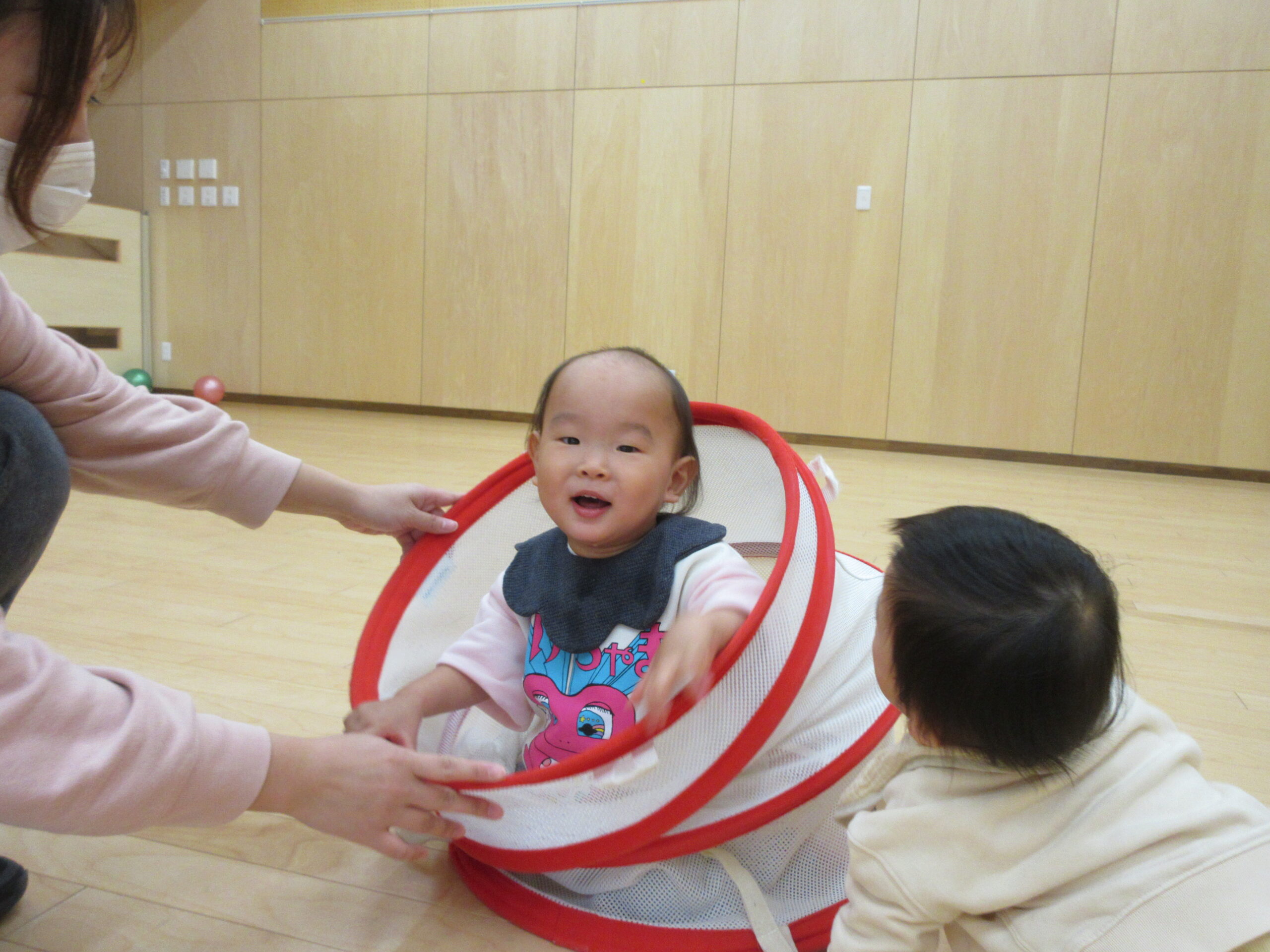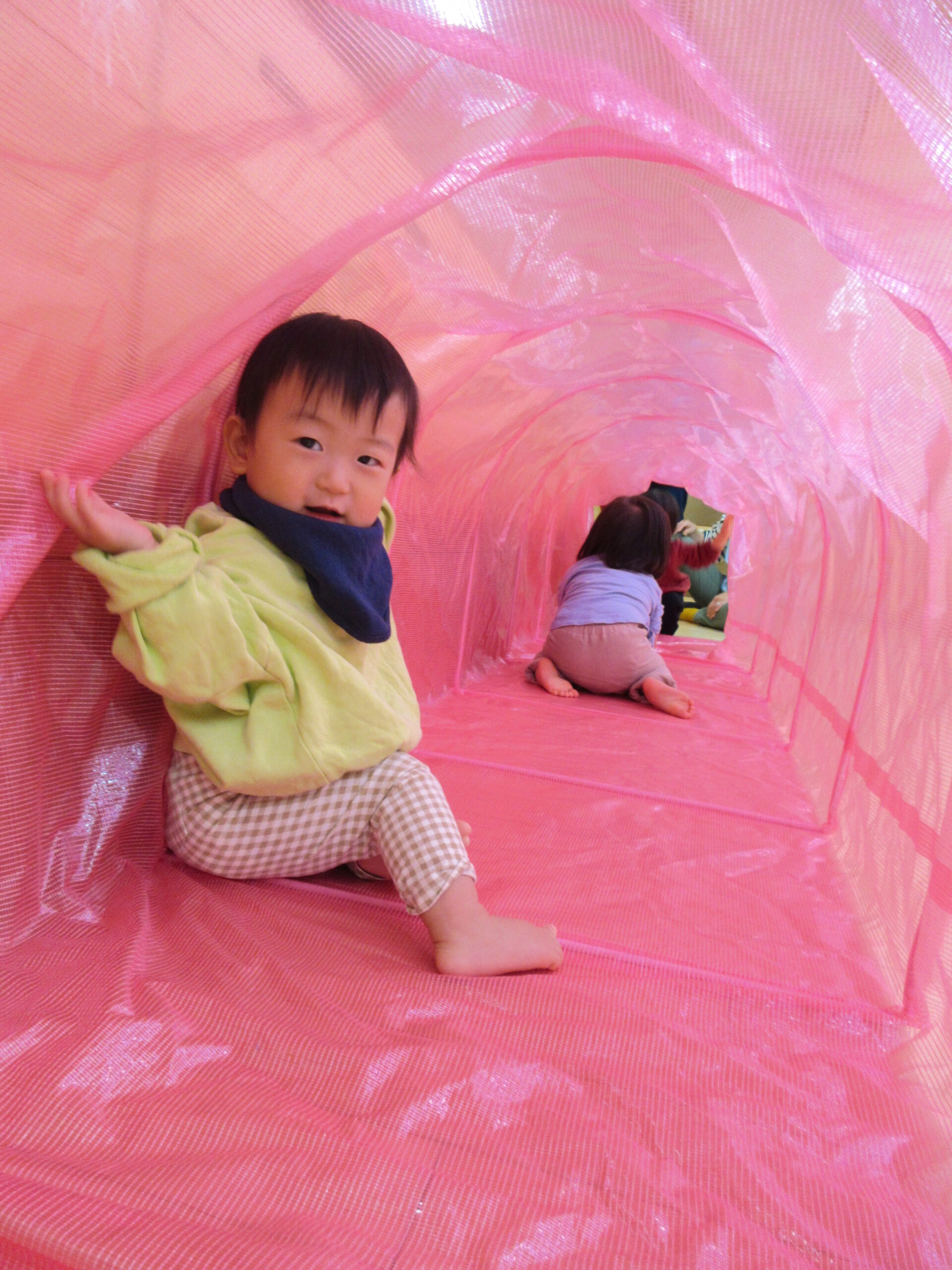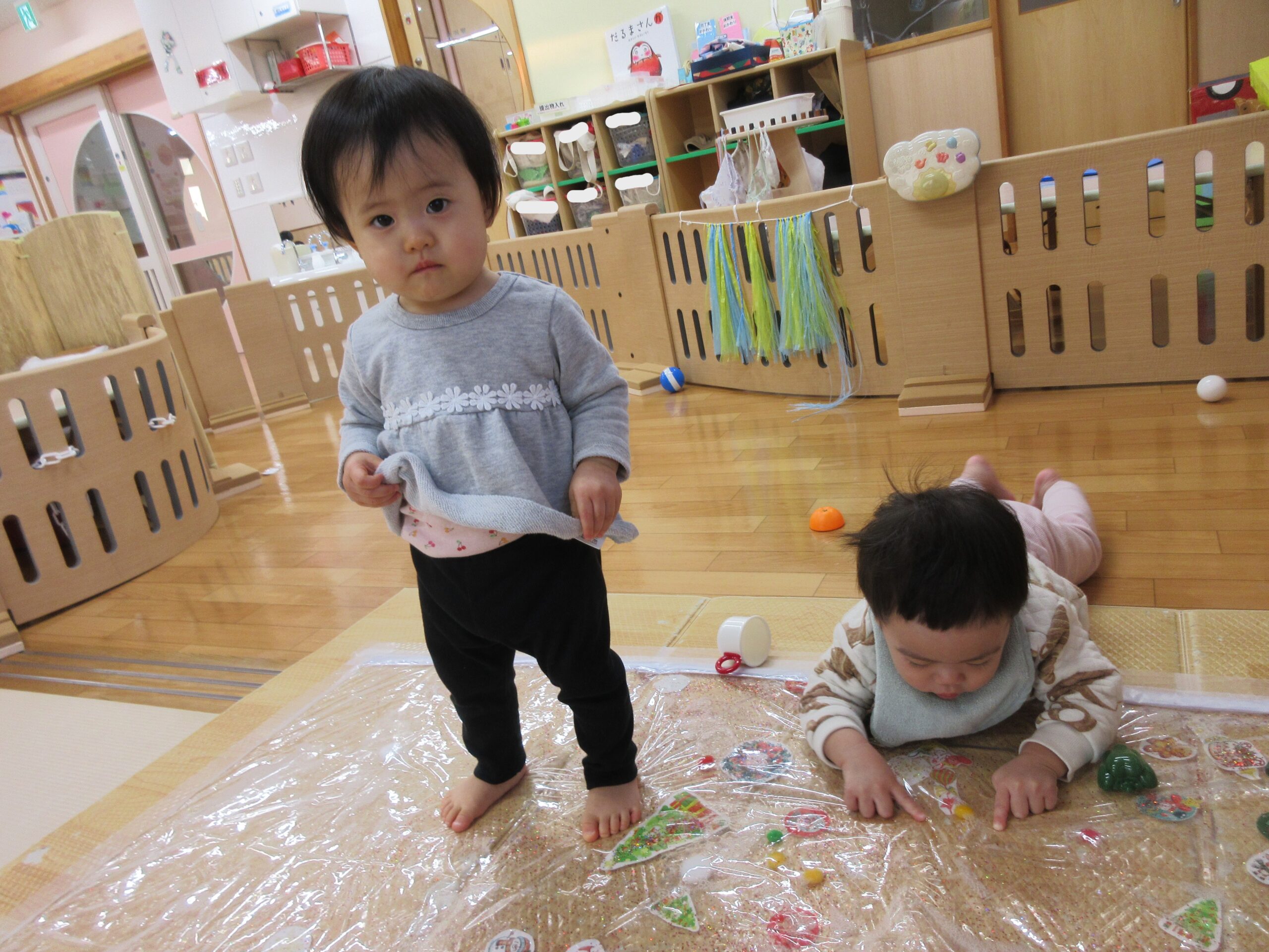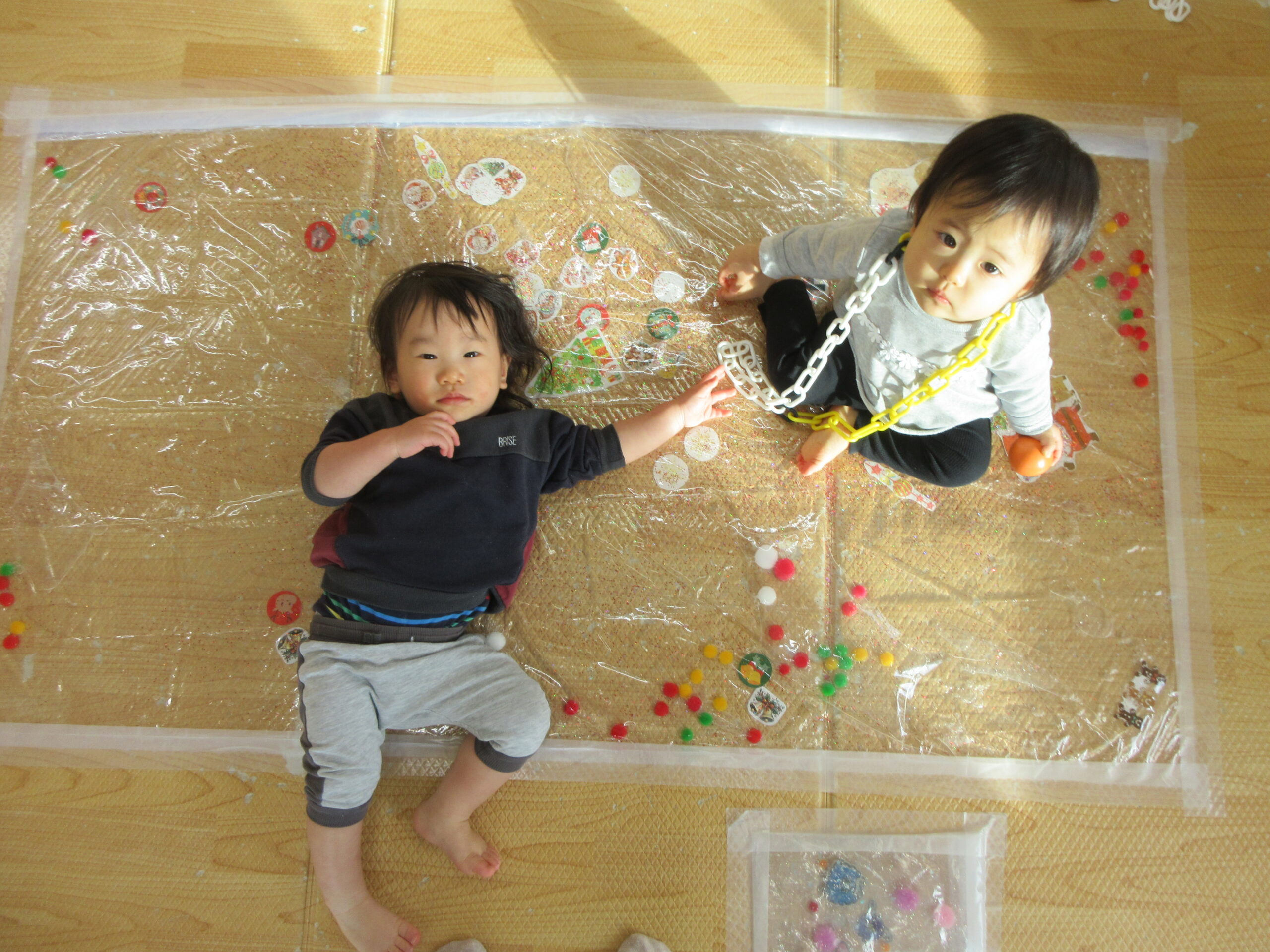 お部屋に大きなセンサリーマットが出来ました!冷たい感触に思わずゴロン…♪