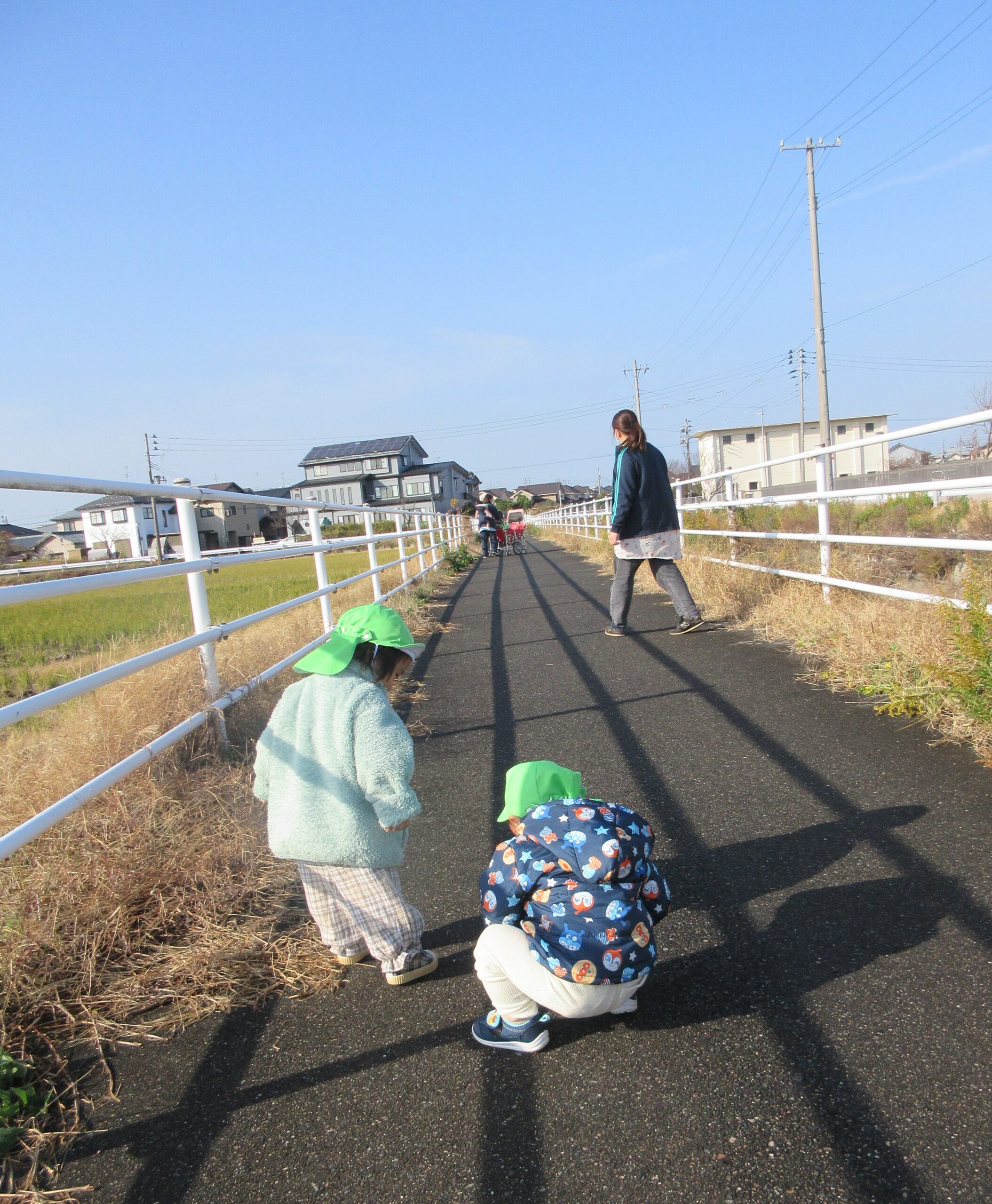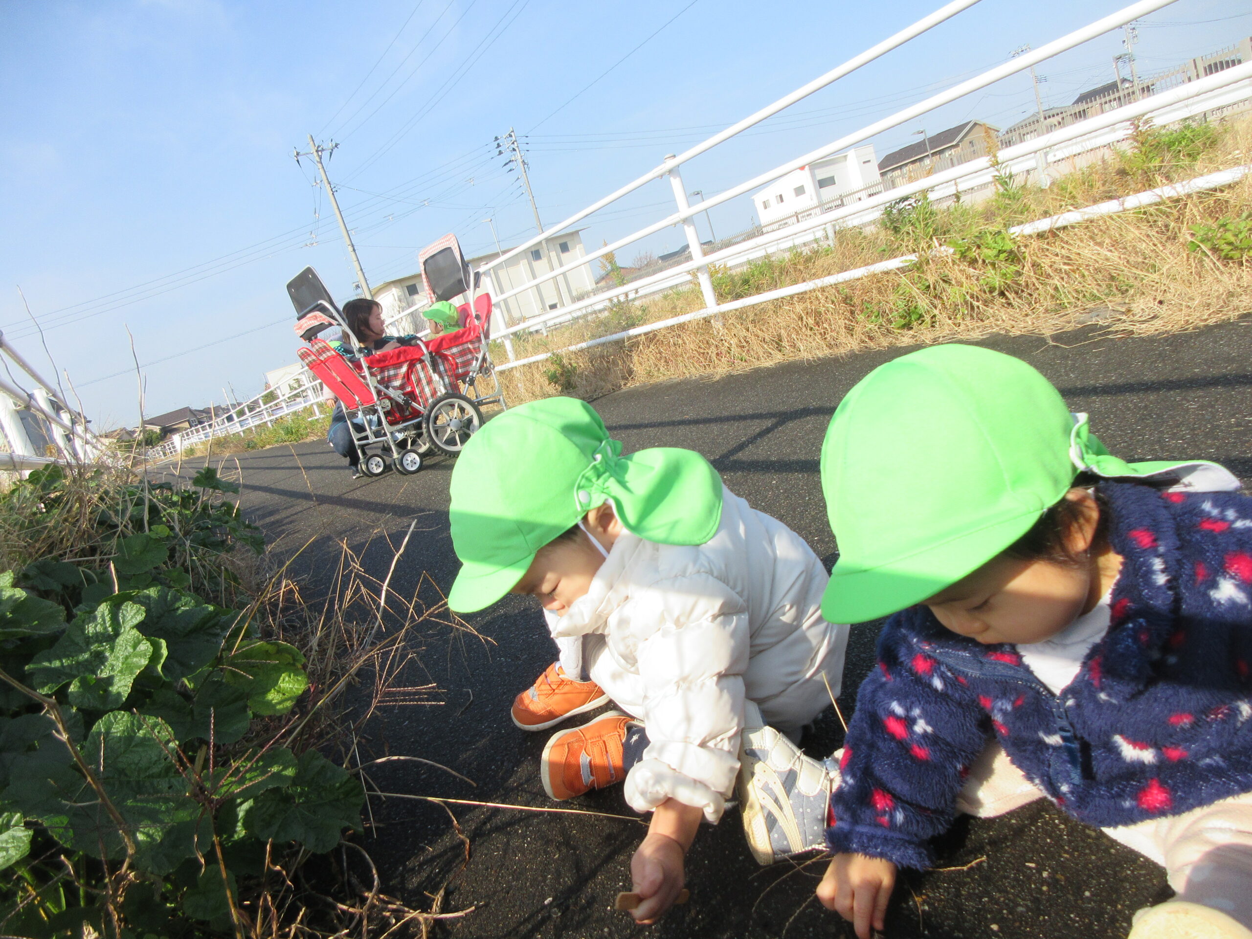 お散歩カートに乗ったり、歩いたりして、近くの遊歩道へいきましたよ。