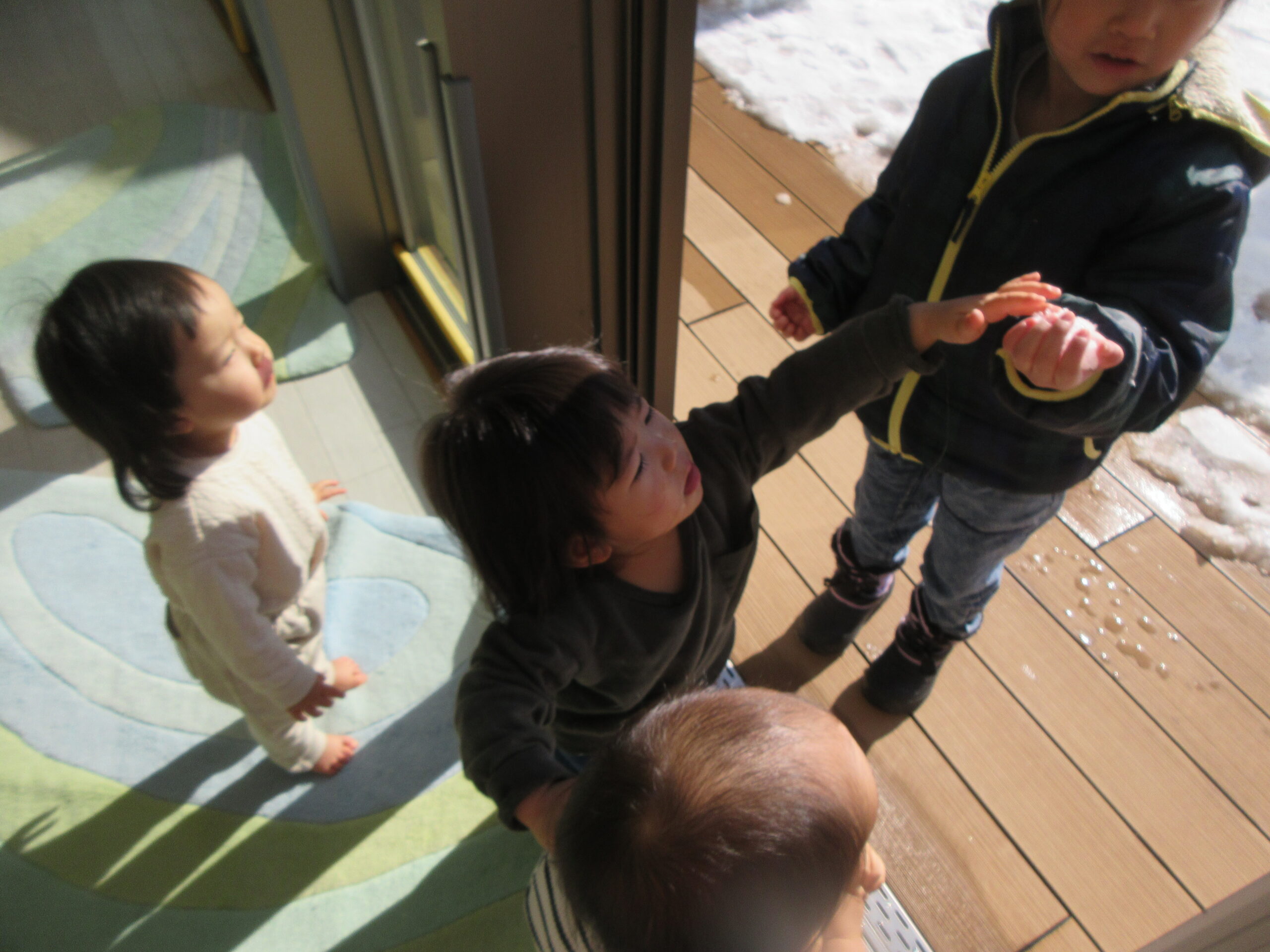 サロンで遊んでいると、たんぽぽ組のおともだちが雪を持って来てくれました。