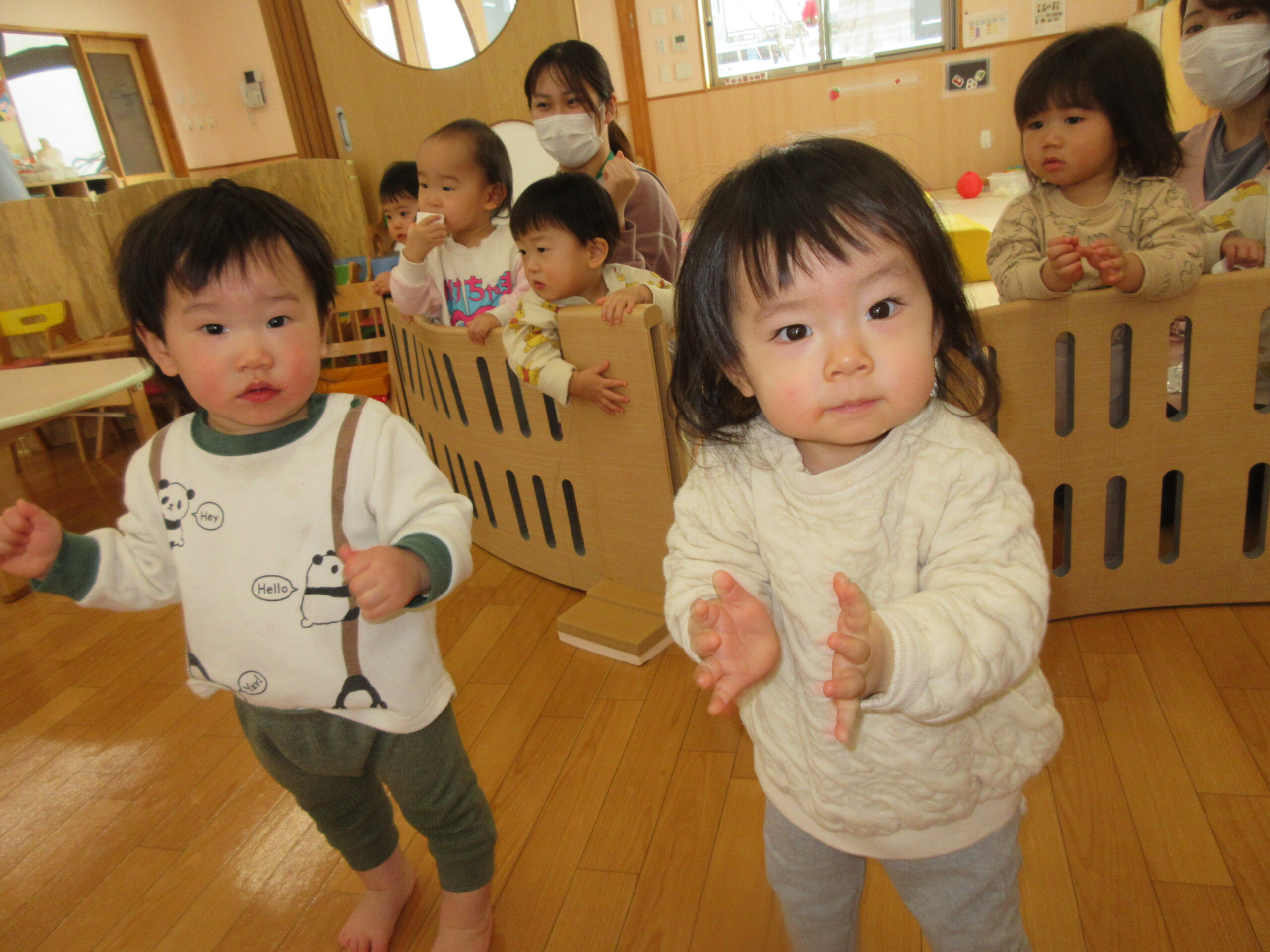 指を指したり、驚いたような声をだしたりしているもも0組さんです☺