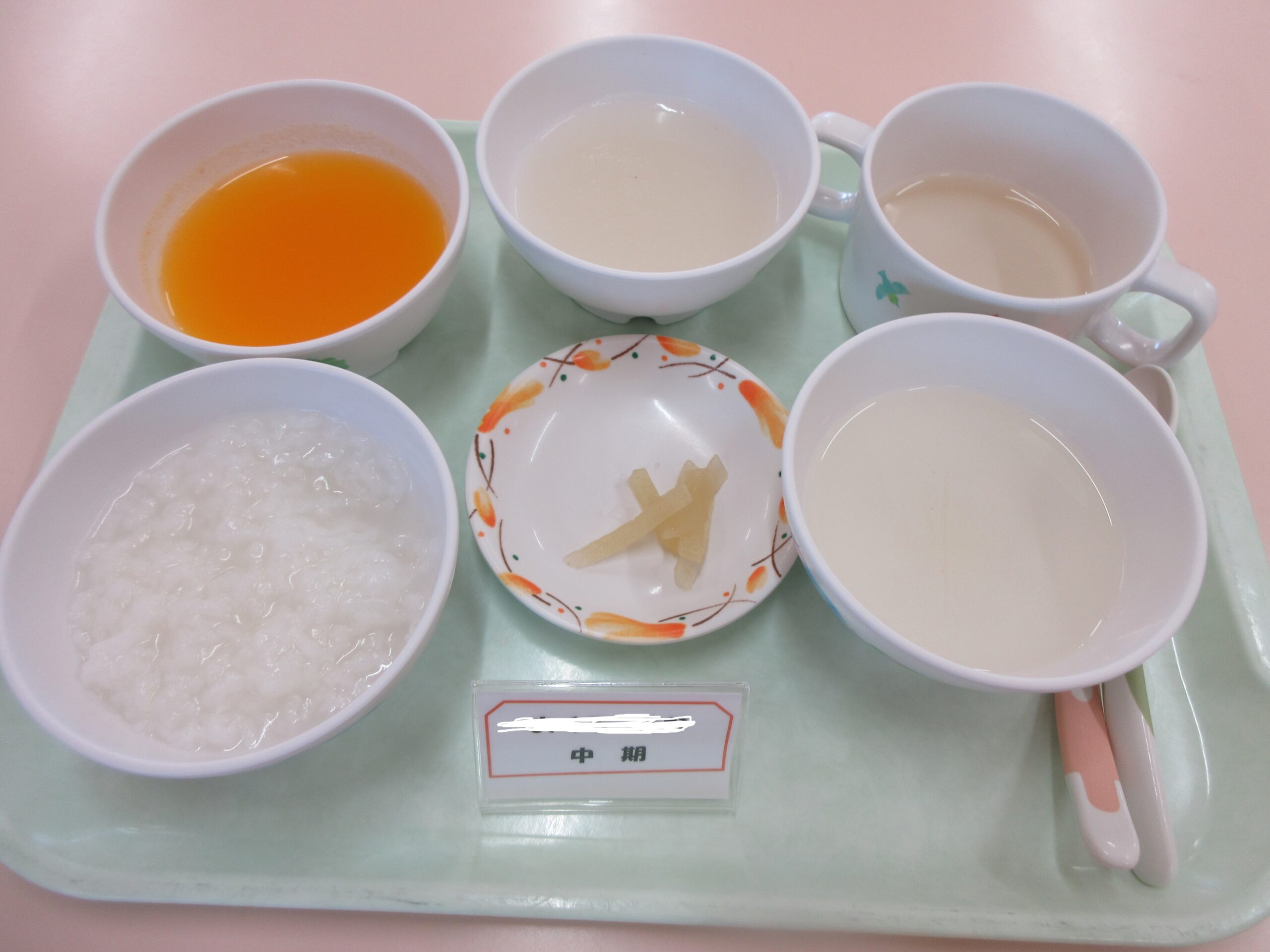 今日のメニューはお粥、野菜スープ、魚のくず煮、野菜の煮物、刻みりんごでした。