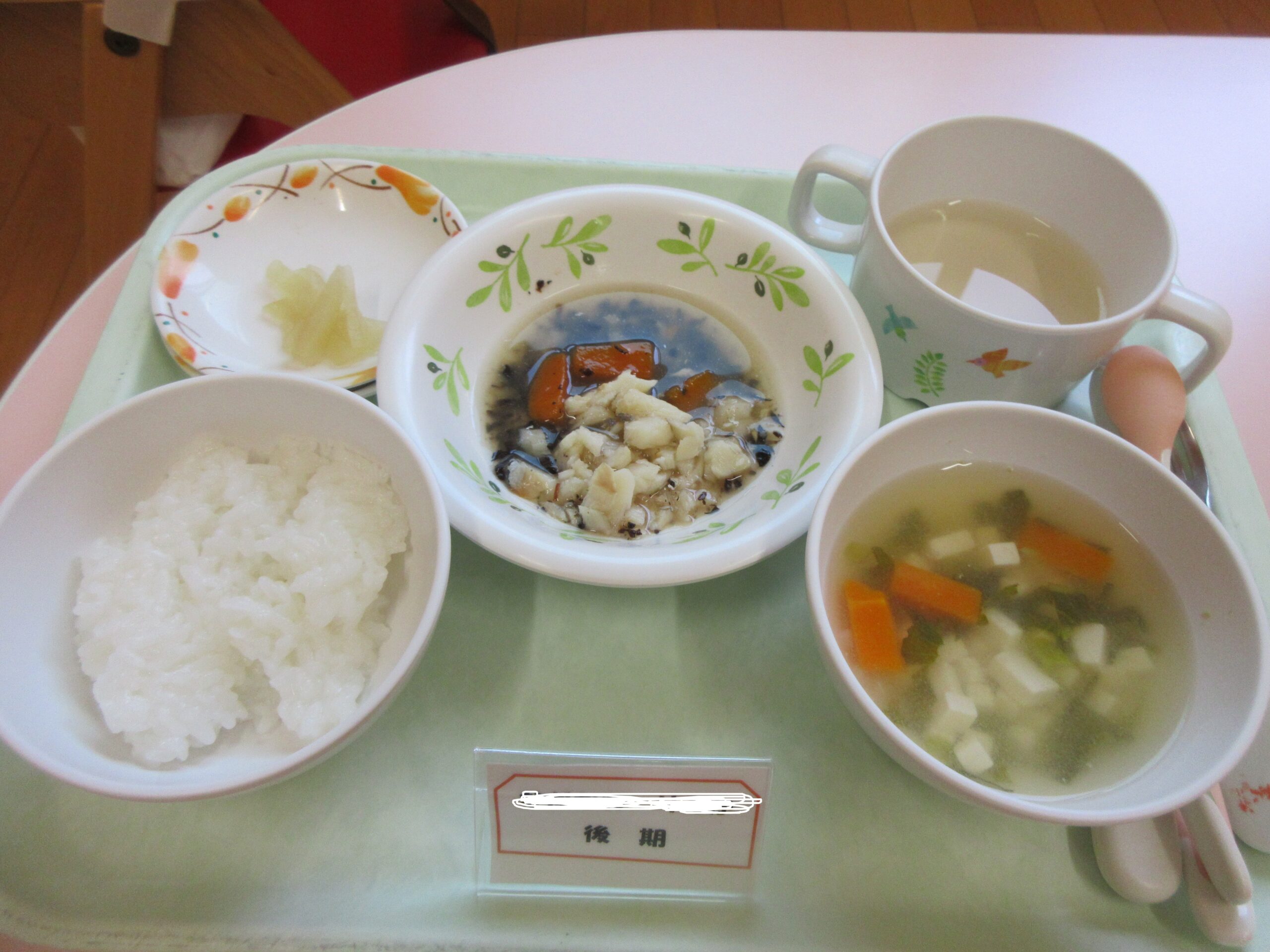 今日のメニューはかた粥、みそ汁、煮魚、ひじきの炒り煮、りんごでした。