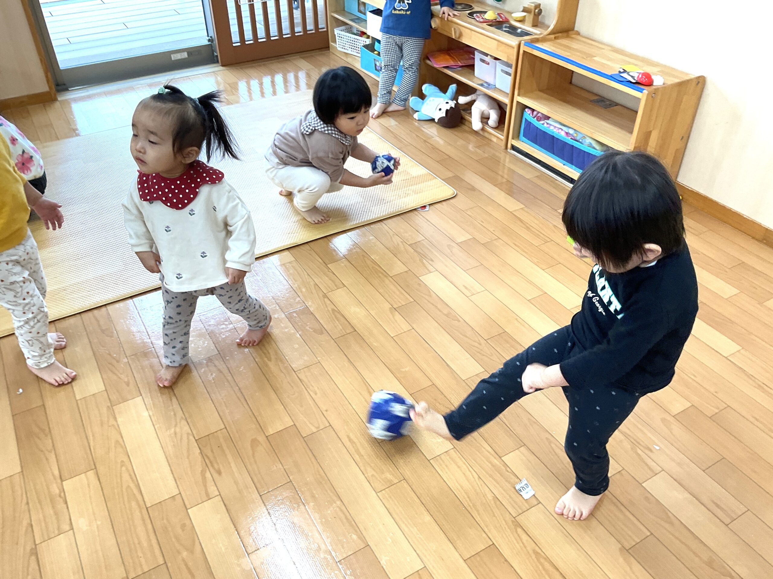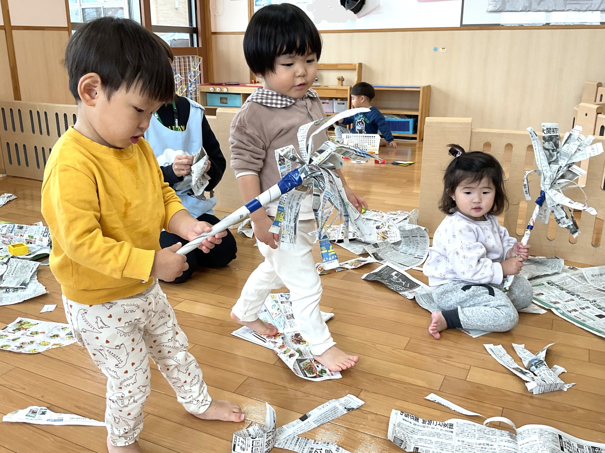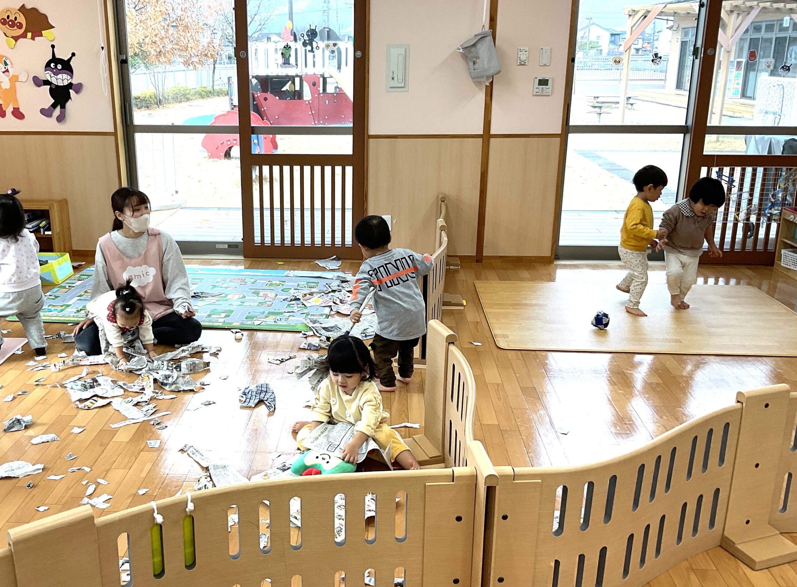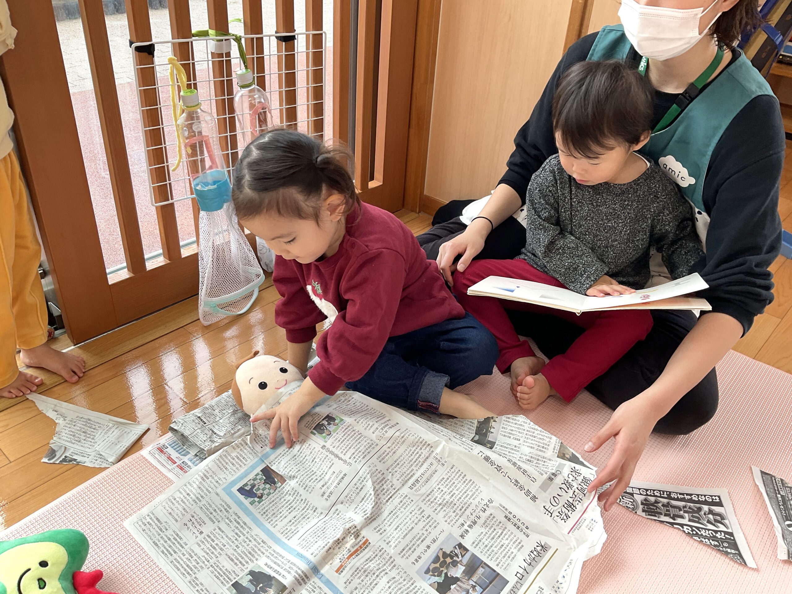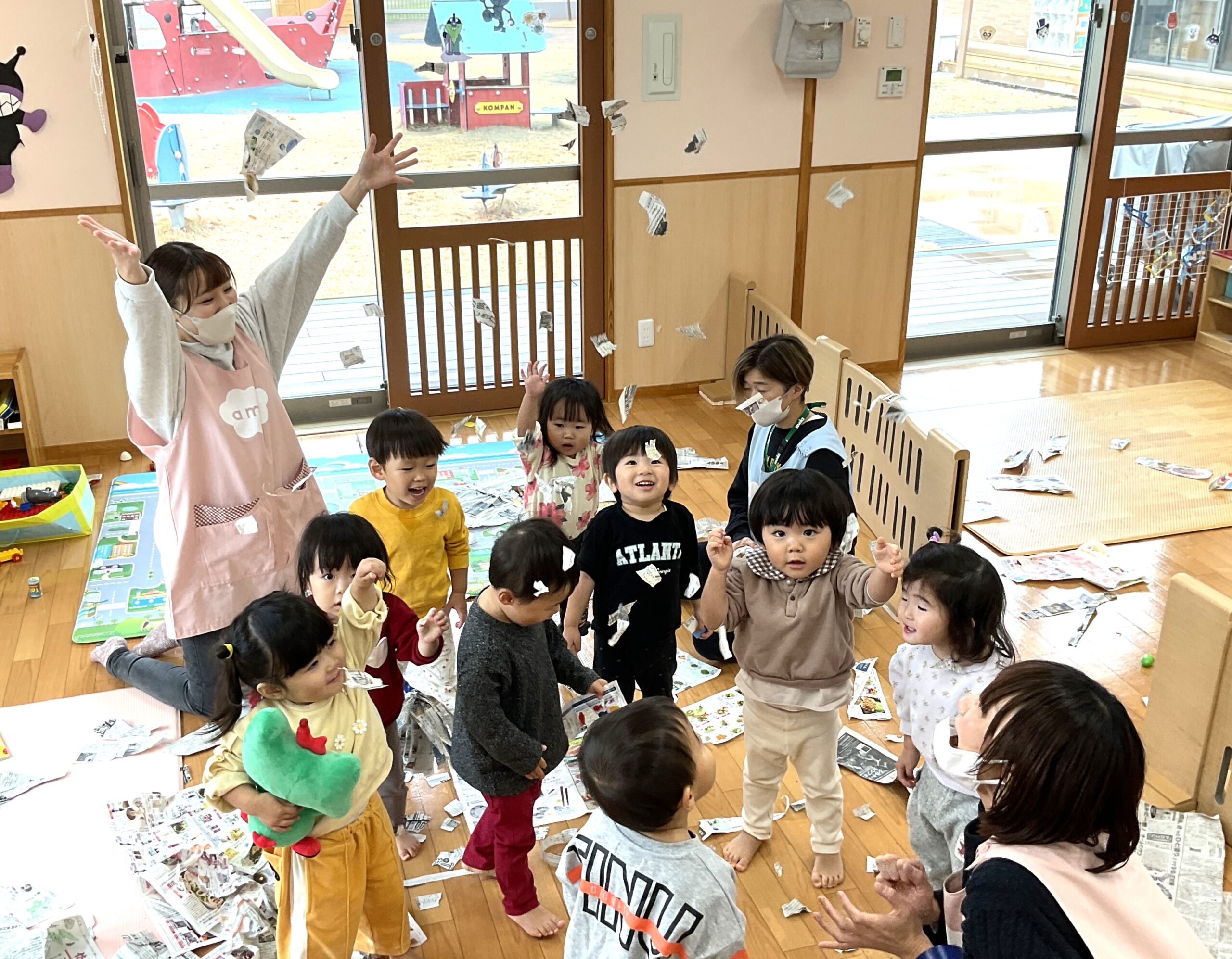 以前、落ち葉のシャワーやお花紙のシャワーで遊んでいたので、今日は新聞紙で作った「雪のシャワー」を楽しみましたよ!雪がヒラヒラ降ってくると「わぁ~!」と声を出して見つめていたこどもたち!