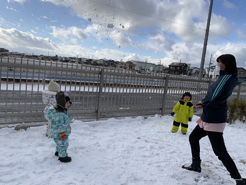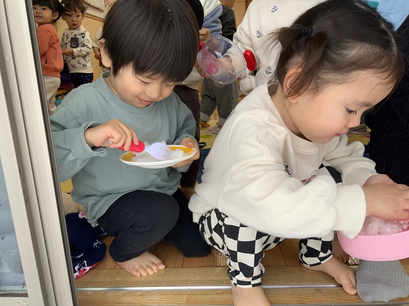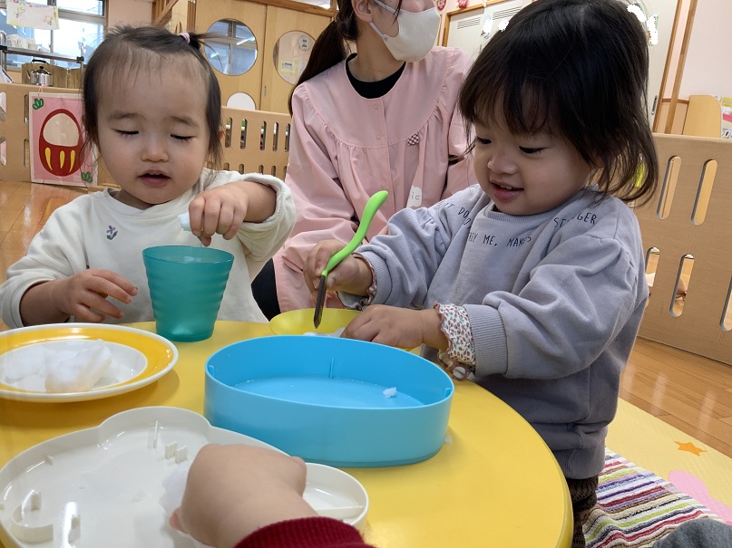 雪に触れると冷たさにびっくりする子や、「ふわふわ」「ちめたい(冷たい)」と感触を楽しむ子がいました。