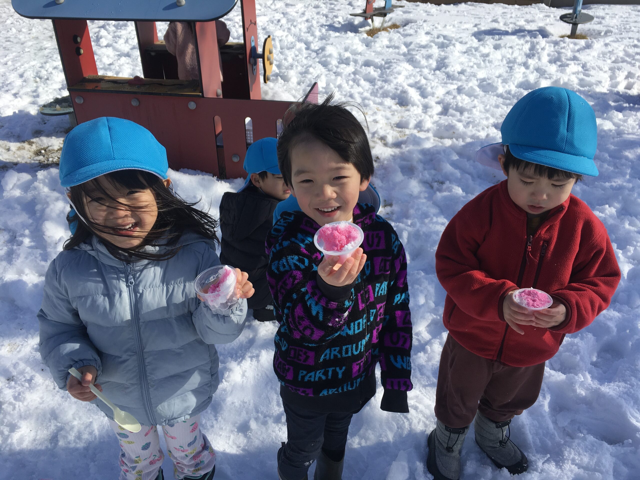 雪が降った日にはかき氷ごっこをして遊んだり、かるた遊びに挑戦したり、正月の製作でだるまを描いたり、、、1月ならではの遊びをみんなで楽しみました♬