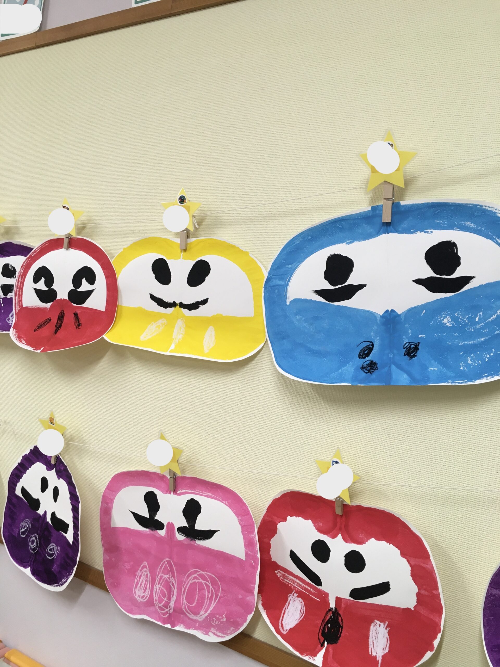 画用紙の半分に絵具をつけて転写でだるまを作ったよ!