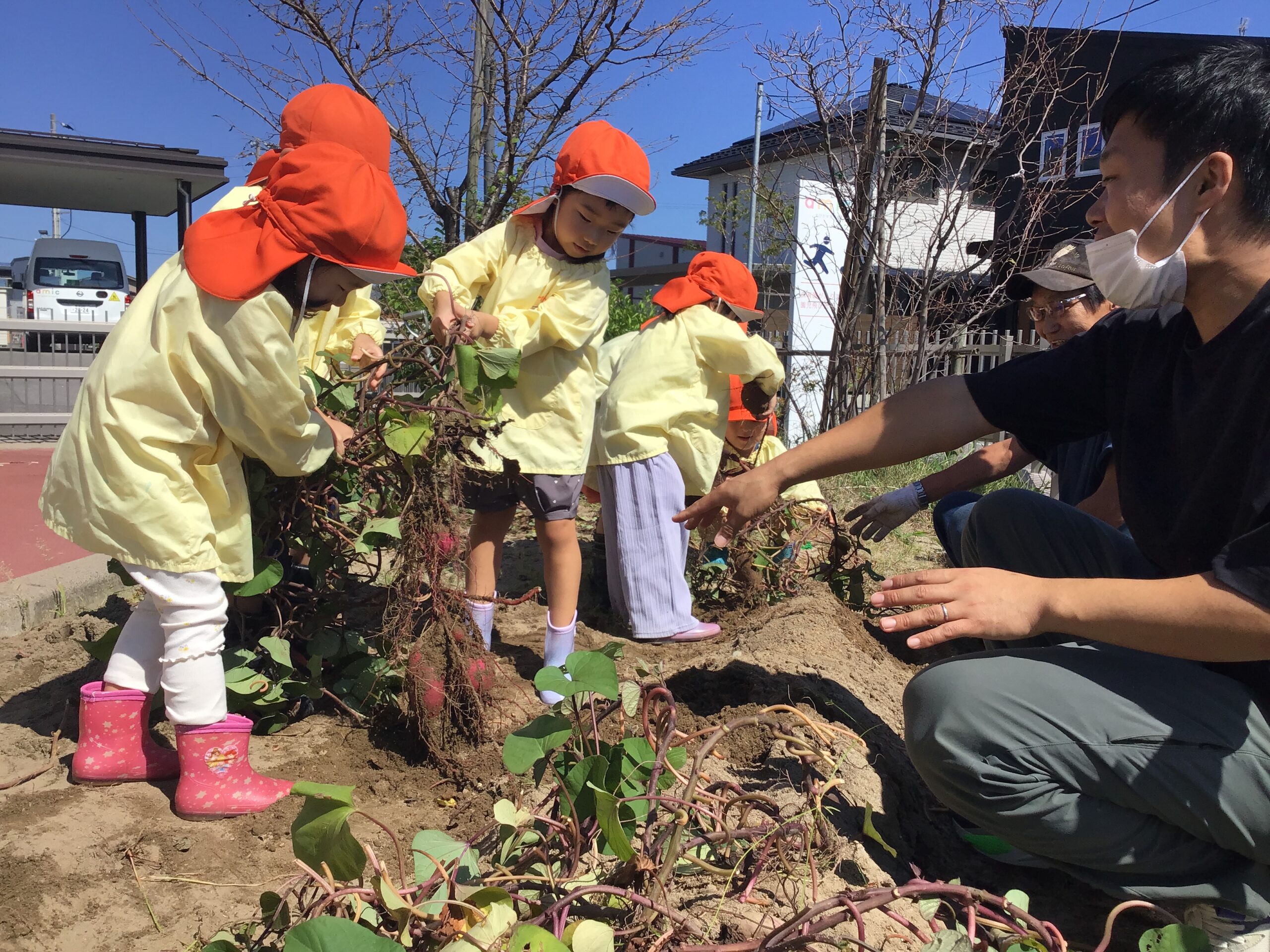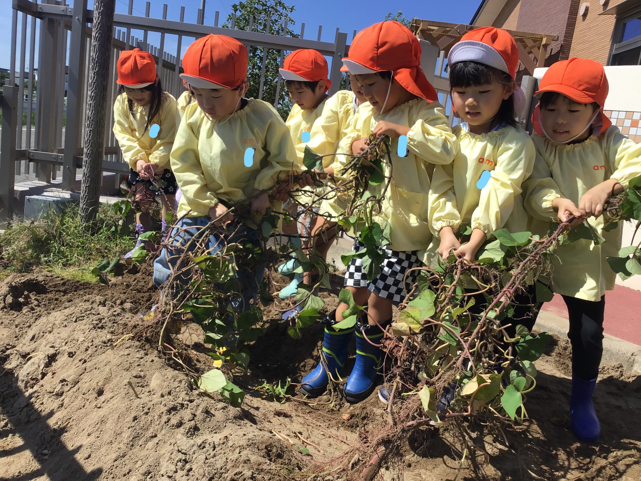 ともだちと力を合わせてつるを引っ張り、サツマイモを収穫しました🌿