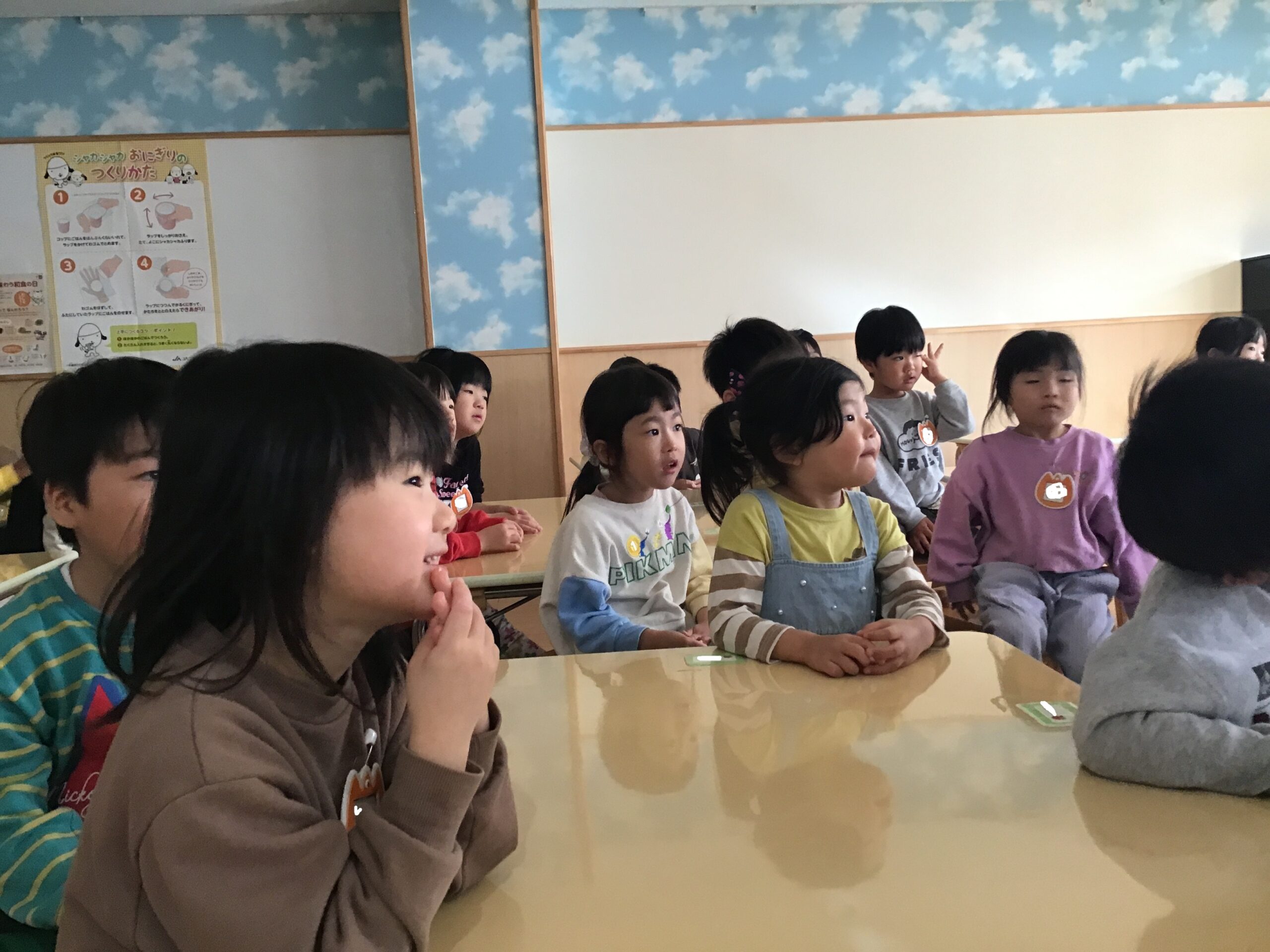 おにぎりの中に茶色いお米が混じっていることに気が付いたこどもたち。「あおぞら米だよ!」とあおぞらさんから教えてもらいました!「あおぞらさんになったらお米作って見たい!」と来年度を楽しみにしていたこどもたちでしたよ~!