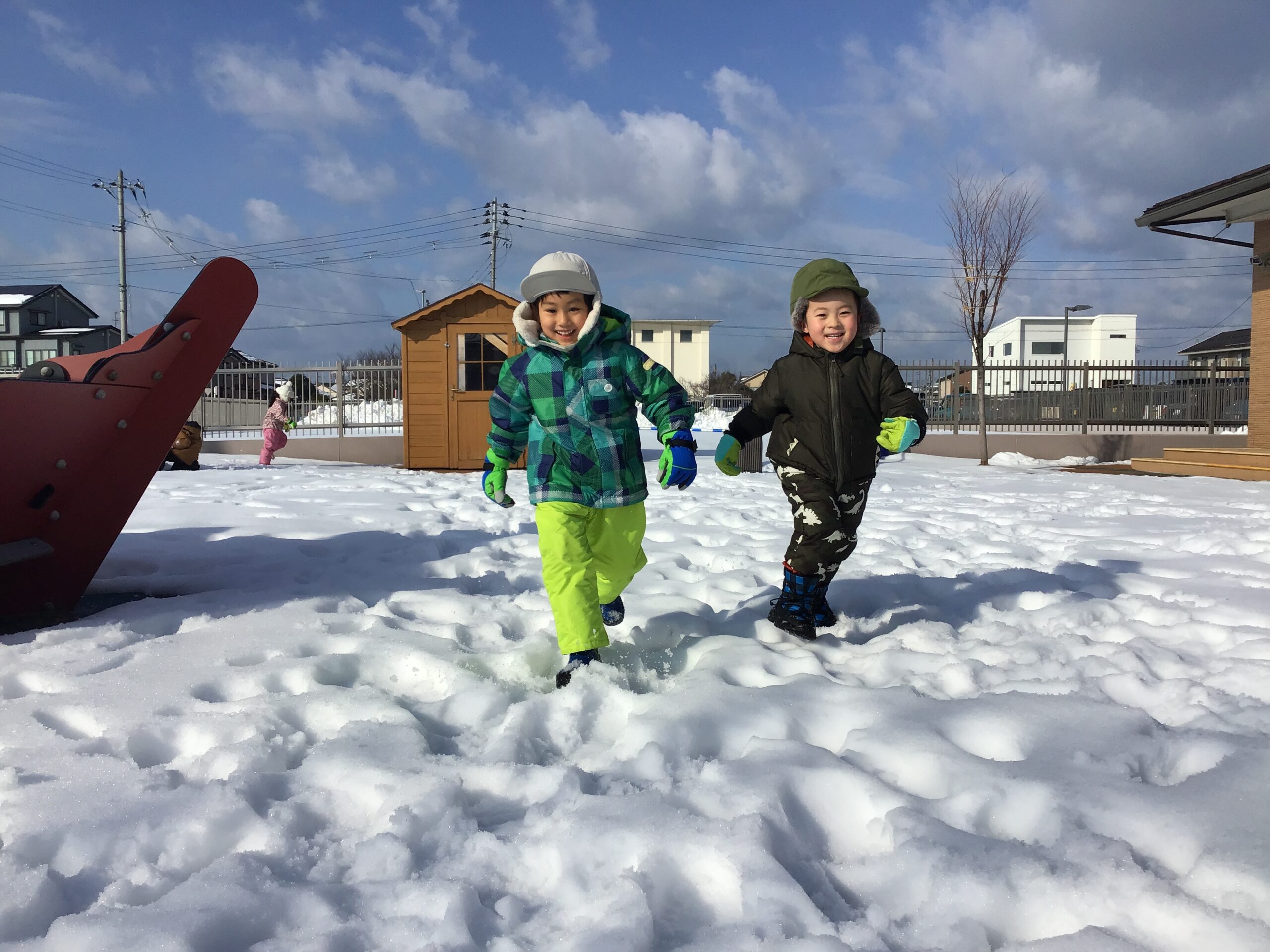 「晴れてるから雪遊びしようよ!」と朝からウキウキなこどもたち。