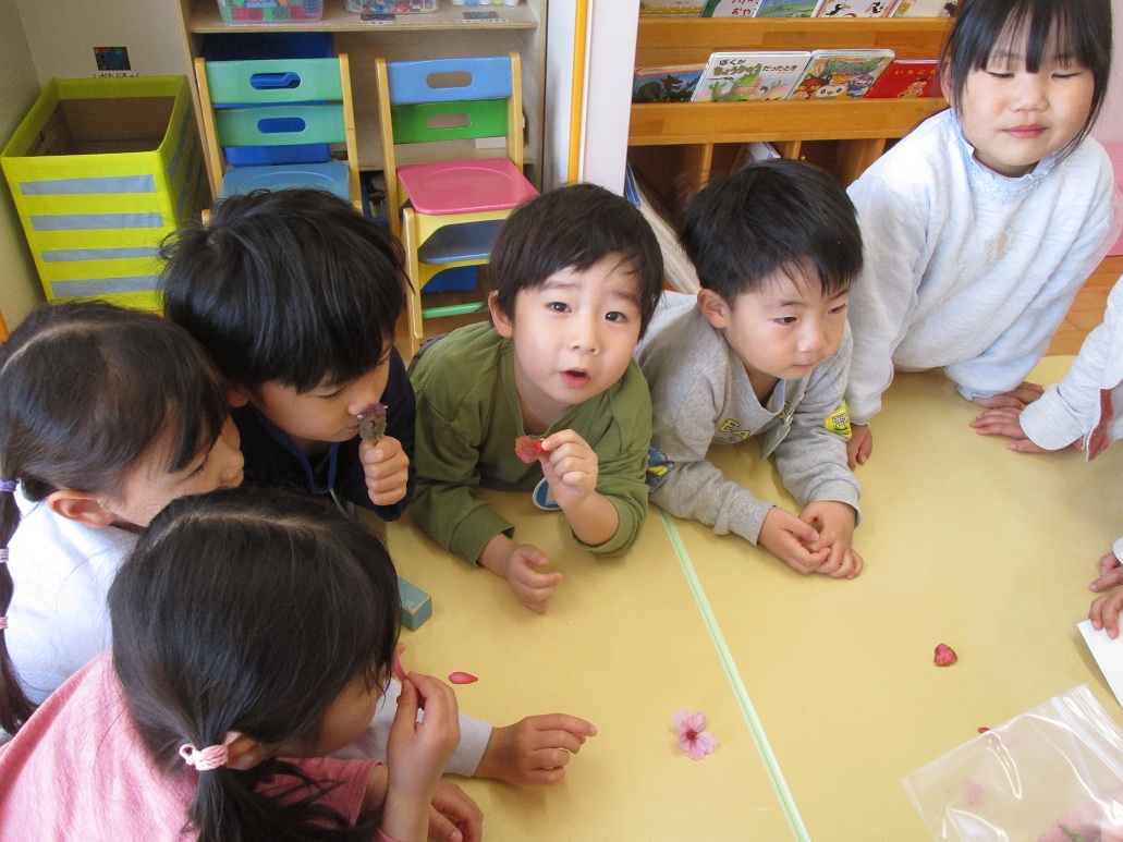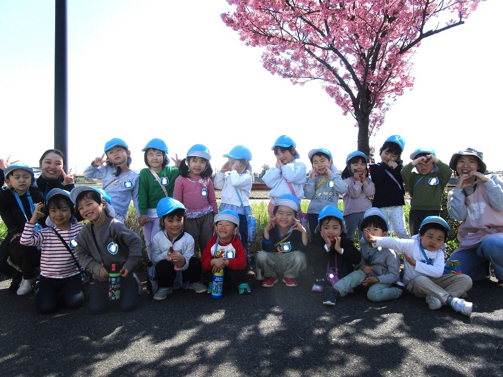先日園庭で遊んでいると、ある子が「先生、桜咲いてるよー!」と園周辺の桜並木を指さして教えてくれました。