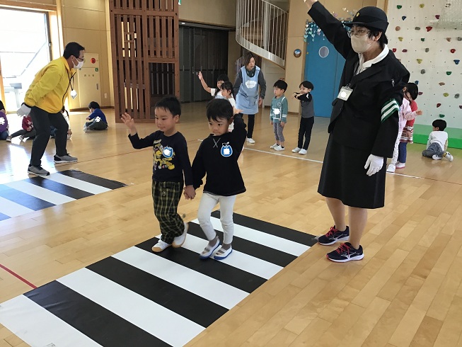 交通安全に関するビデオを見たり、安全な横断歩道の渡り方をゲーム形式で実践したりしました。